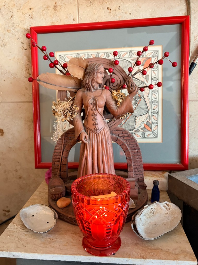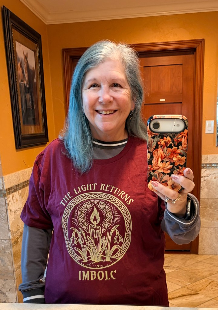 All in all I enjoyed my day of finishing my red solidarity hat, donning my Imbolc t-shirt, and gazing at the candles on my Brigid altar.