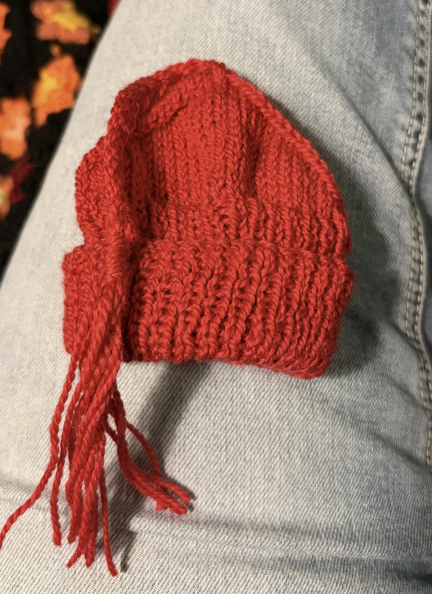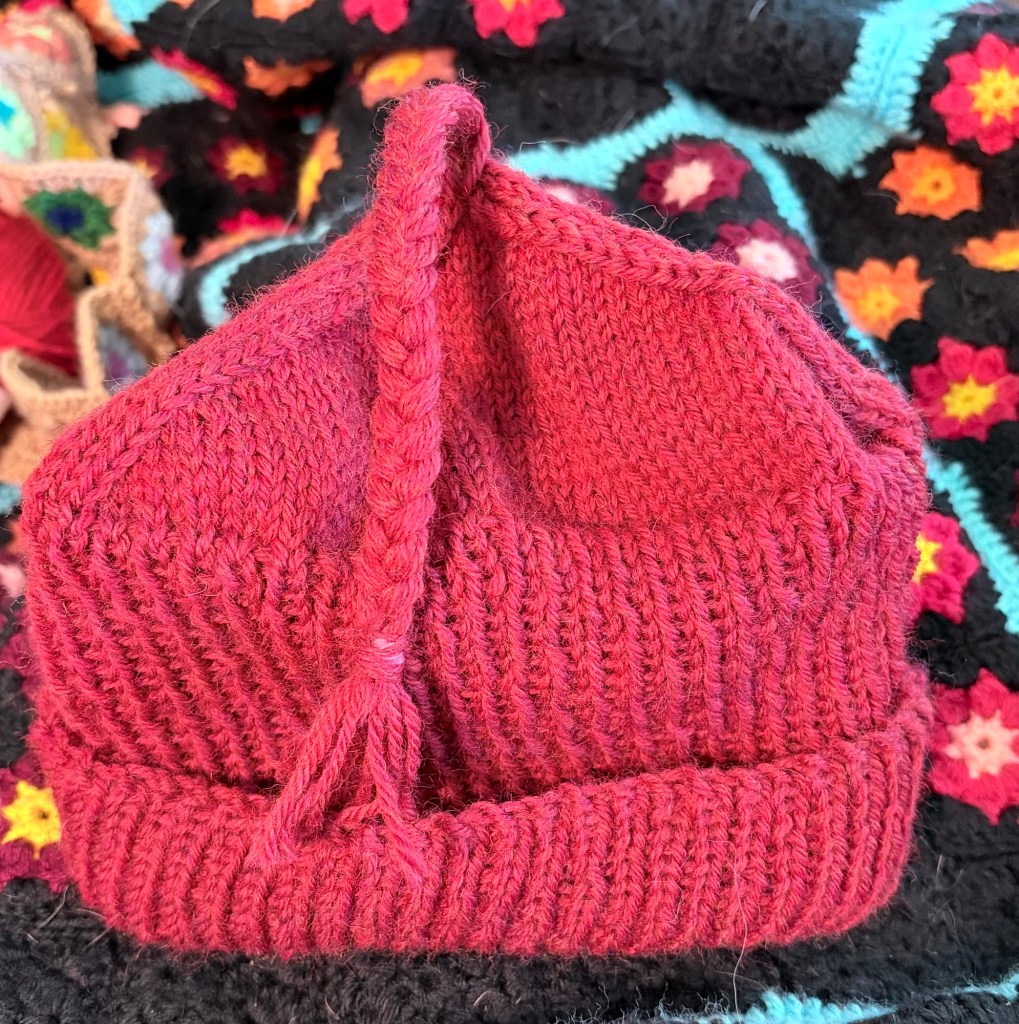 It’s okay, though, because I finally found the set of short size 4 tips and a shorter cable. This has enabled me to start a new hat with some beautiful red wool I found. So far it’s an inch of K1 P1 ribbing.