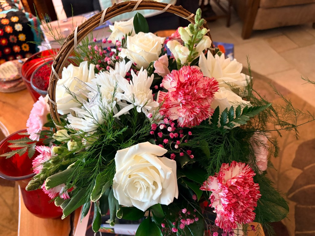 Otherwise it was a fun day in which I indulged in watching educational television, enjoyed looking at my pretty Valentine flowers, and crafted my heart out. I finished another red Danish hat, to replace the one I made that’s going to Canada for a friend, as soon as the Post Office opens again, which I made slightly larger than the pattern called for in DK yarn. Too long sentence, too bad.