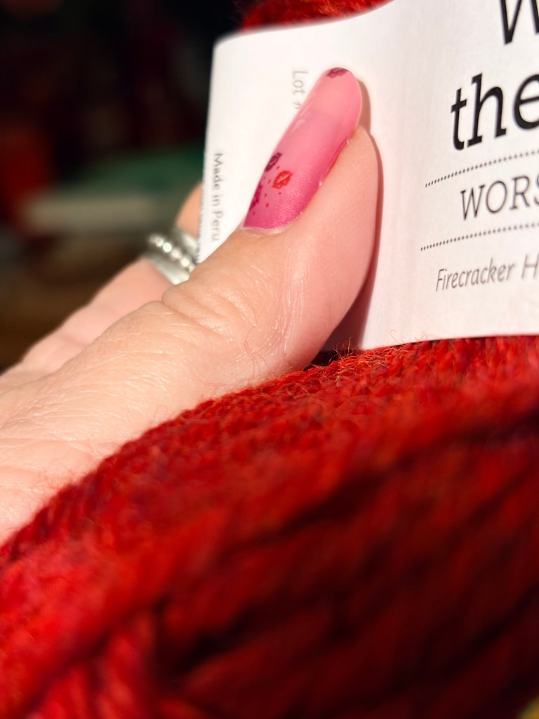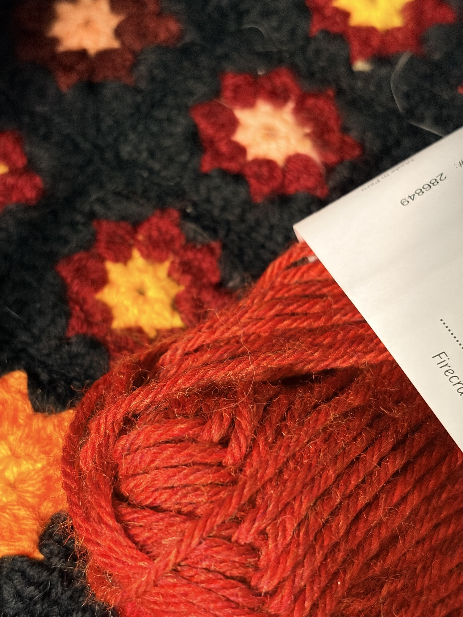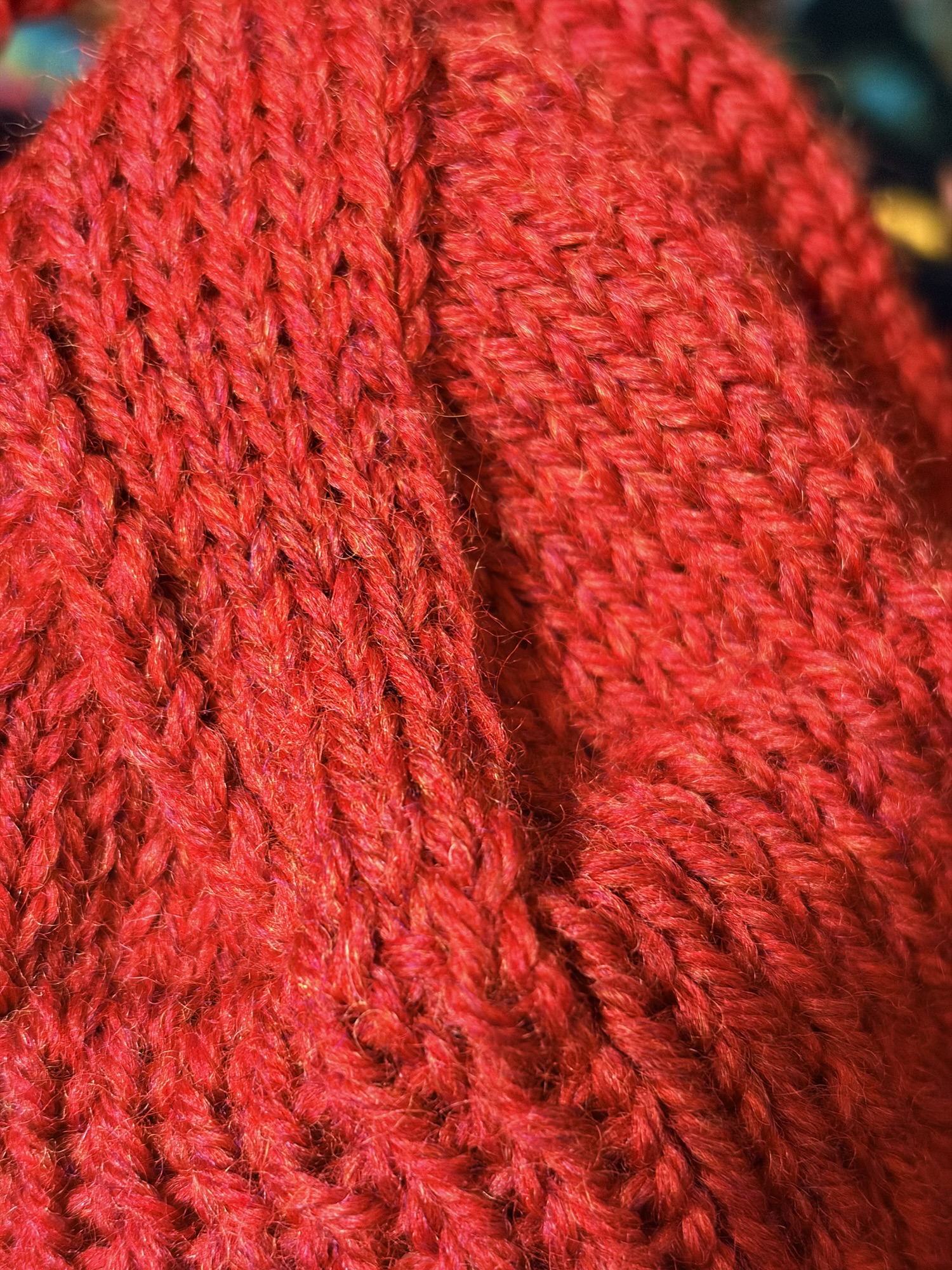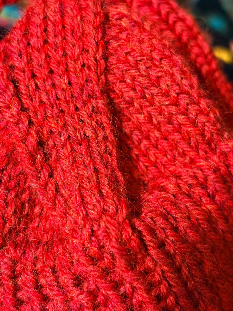 I was working on it in the car and realized why the yarn color is called Firecracker Heather. There are tiny bits of blue, green, and yellow fiber in the yarn, like firecrackers! That gave me a chuckle.