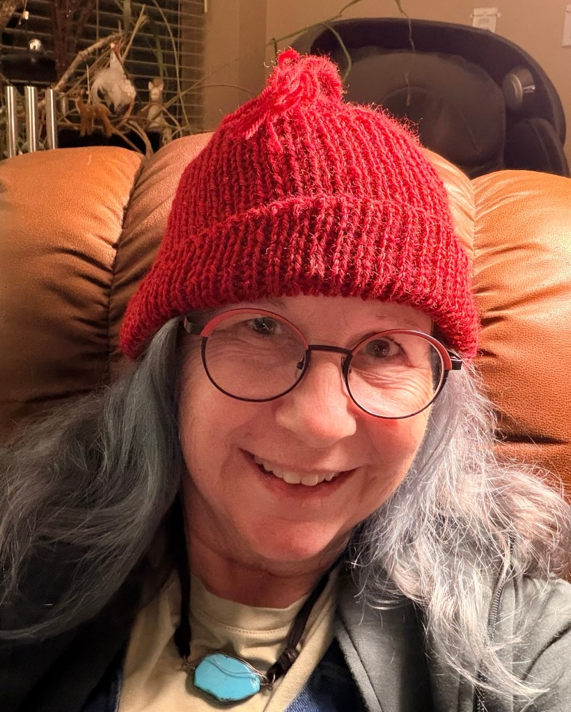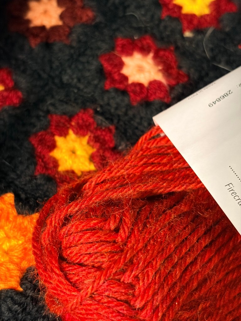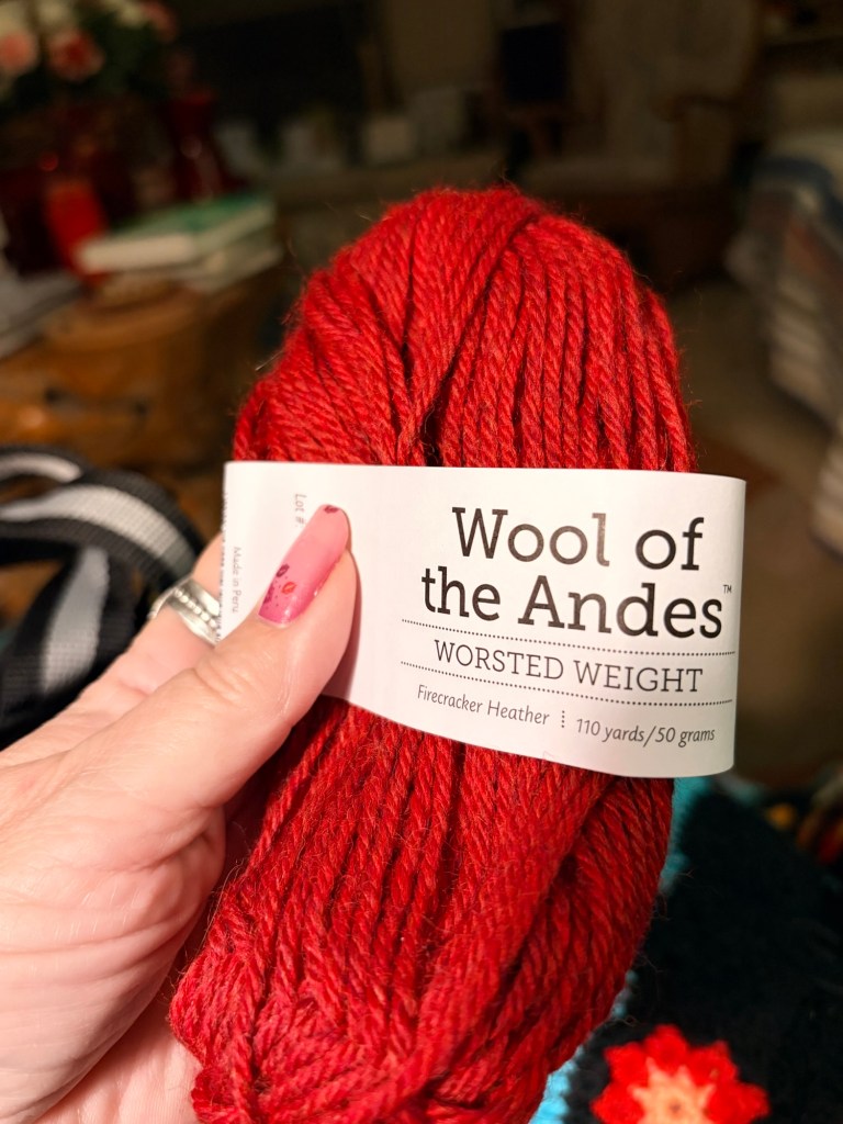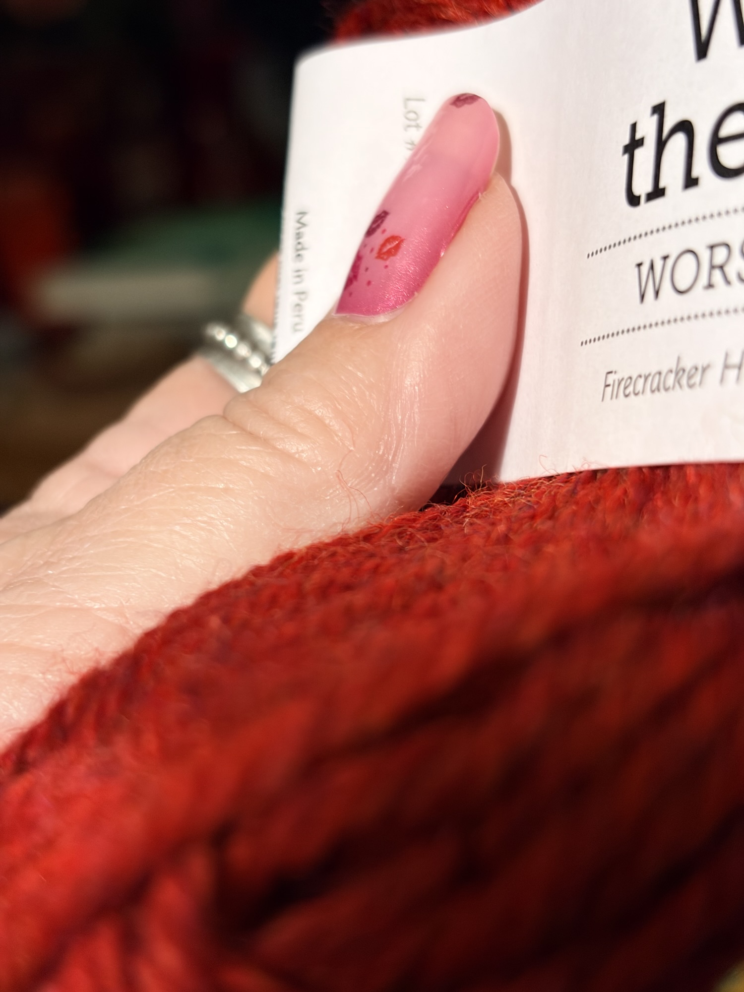 I was working on it in the car and realized why the yarn color is called Firecracker Heather. There are tiny bits of blue, green, and yellow fiber in the yarn, like firecrackers! That gave me a chuckle.