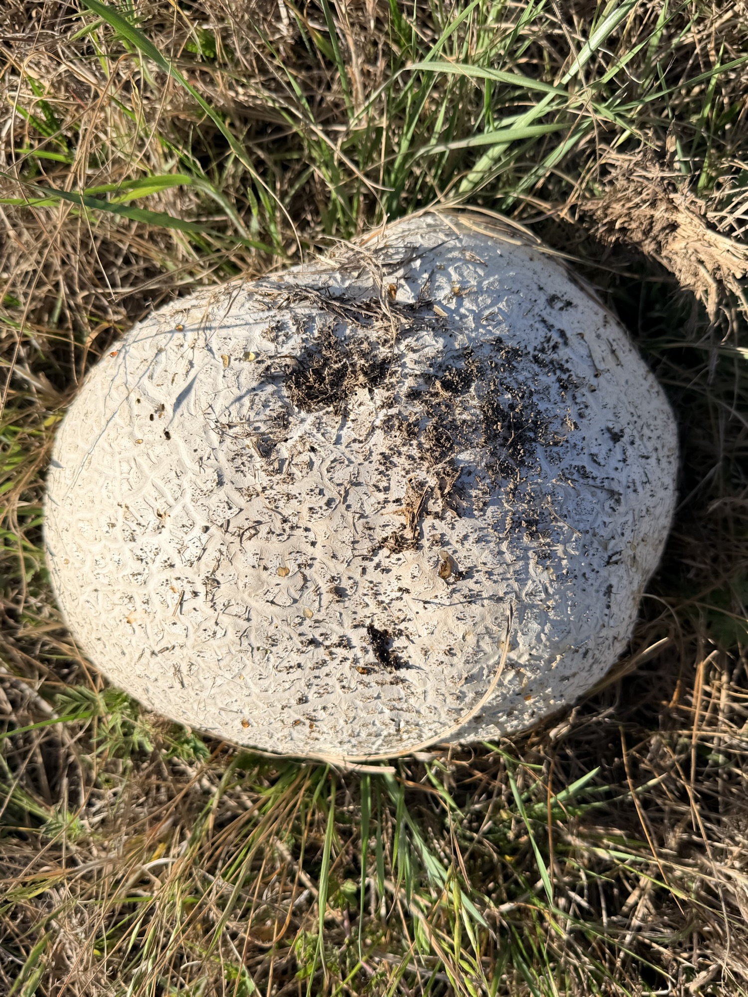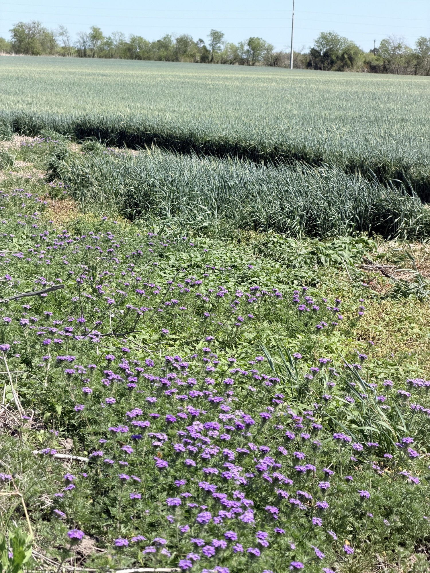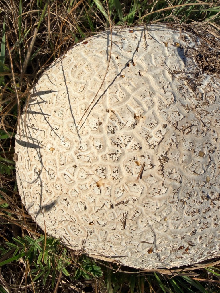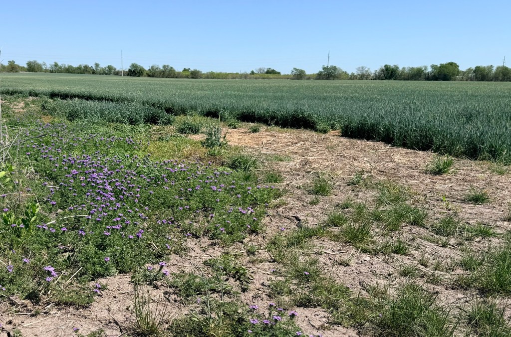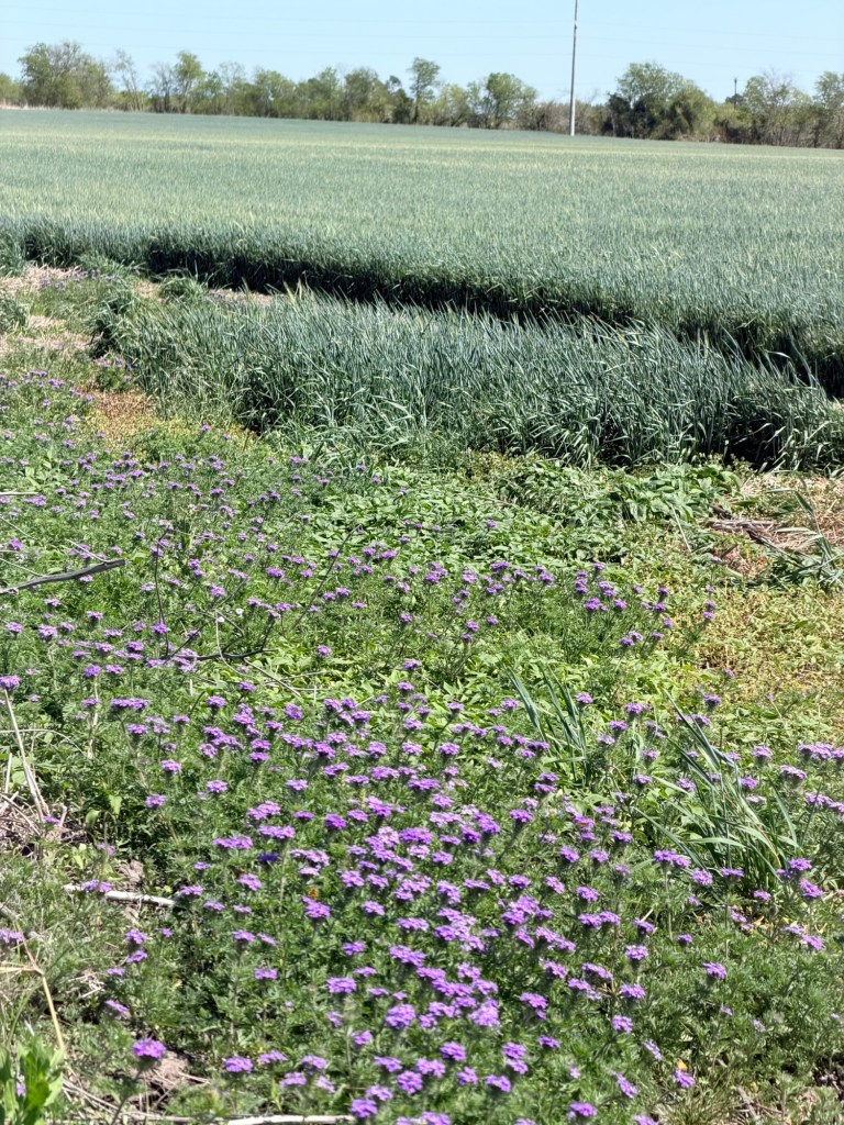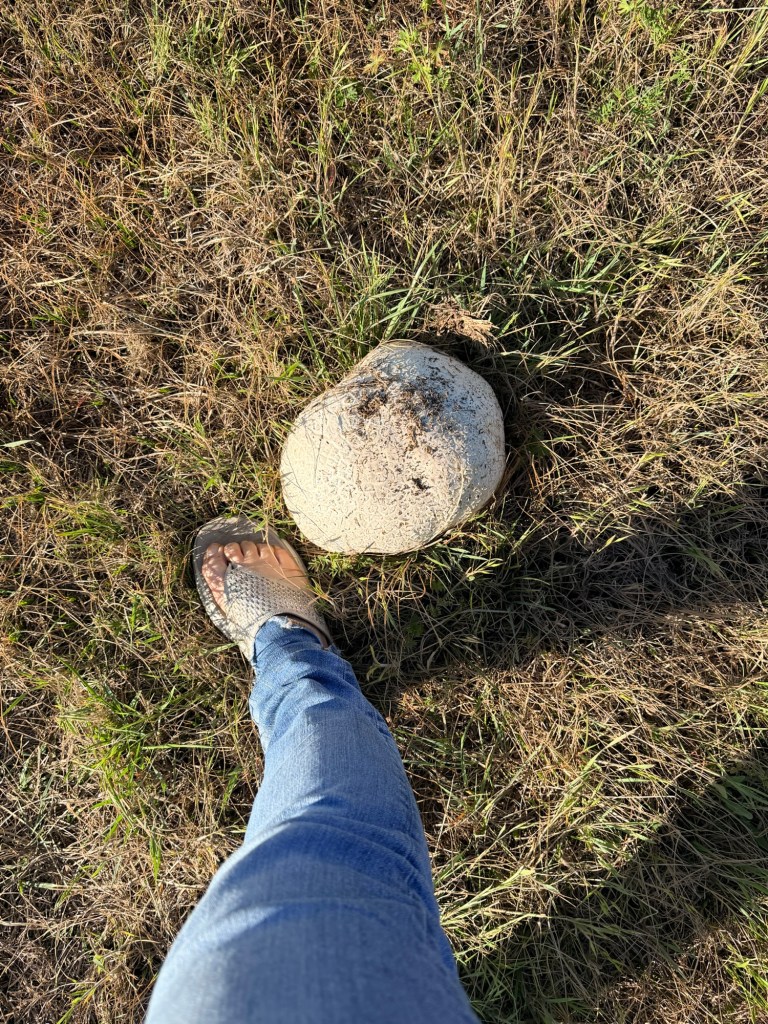 Later in the afternoon I went out again with Kathleen, since walking is helping her recuperation. I showed her how big the puffball mushroom in the front field has gotten, and we found a thick patch of verbena next to the rye crop across the road. Apache would sure love that field.