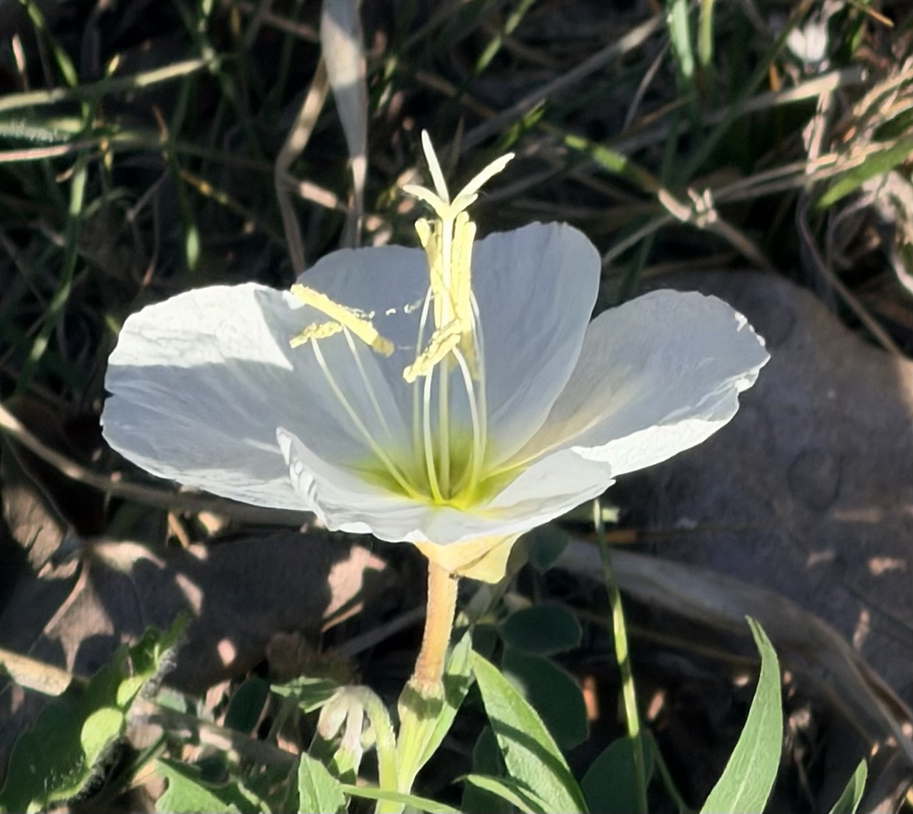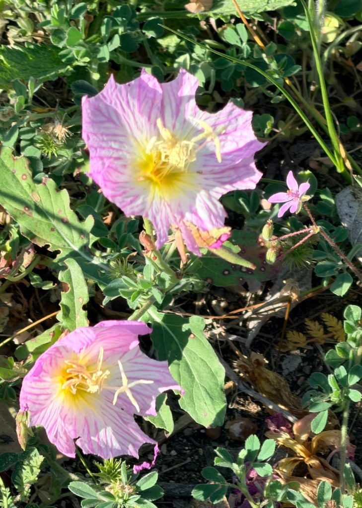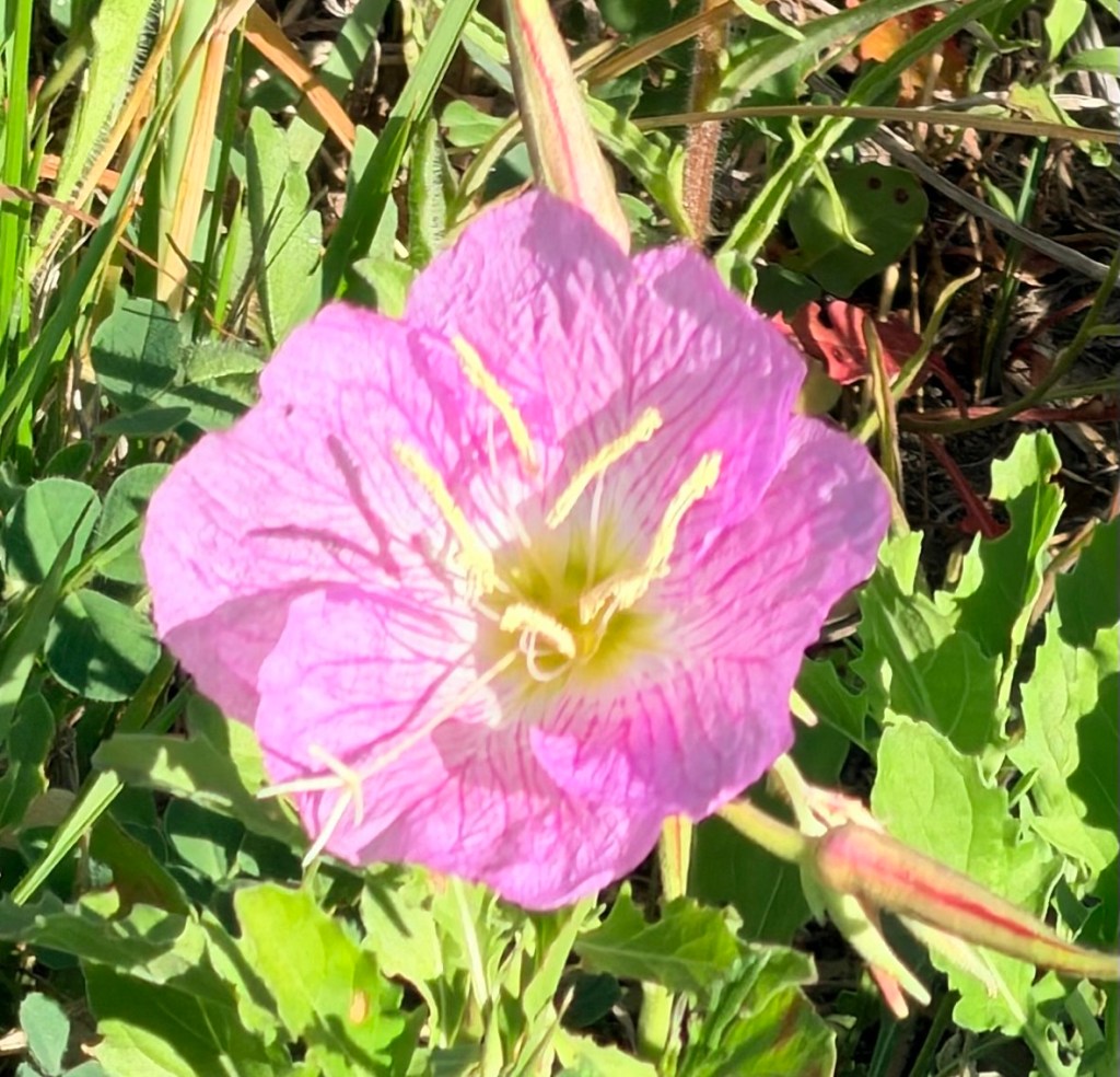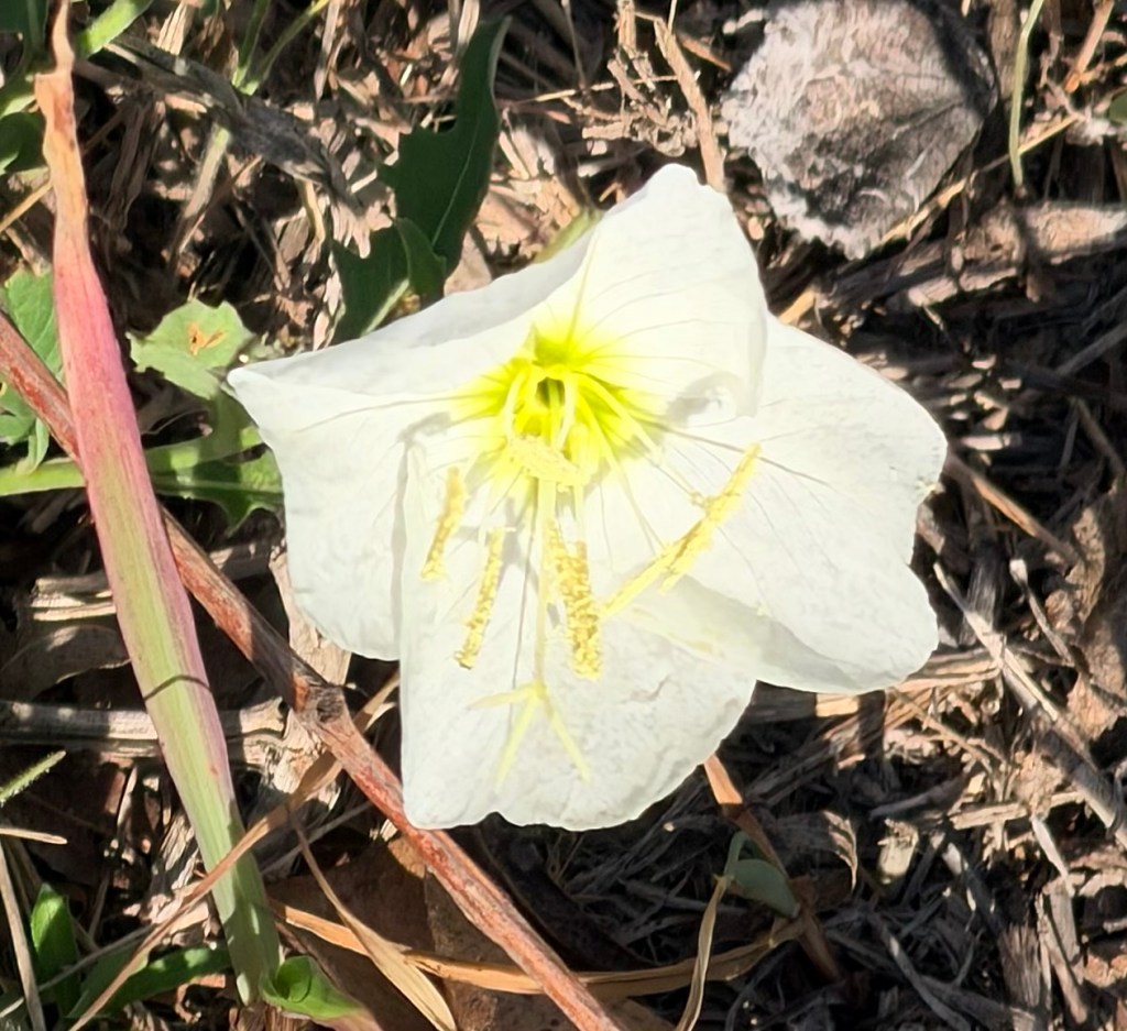 Walking! I didn’t walk all that far today, but I enjoyed it. On my first walk I noticed all the grass and such is already crunchy and brown thanks to scant rain and that freeze a week ago. But there were white evening primroses, which are even more delicate than their normal pink friends.