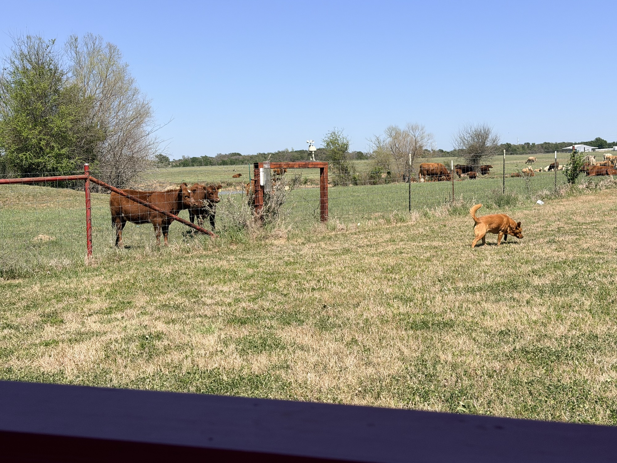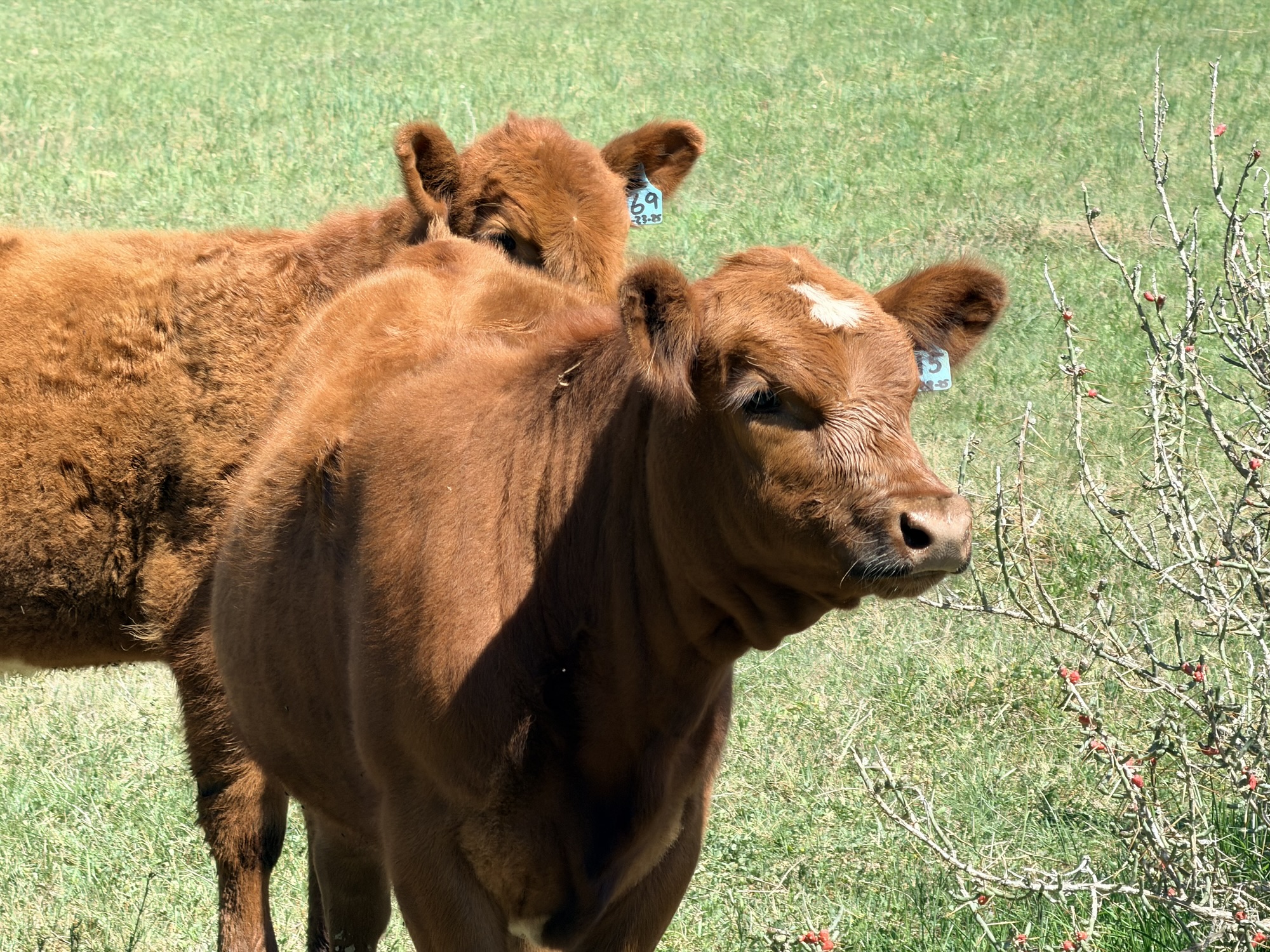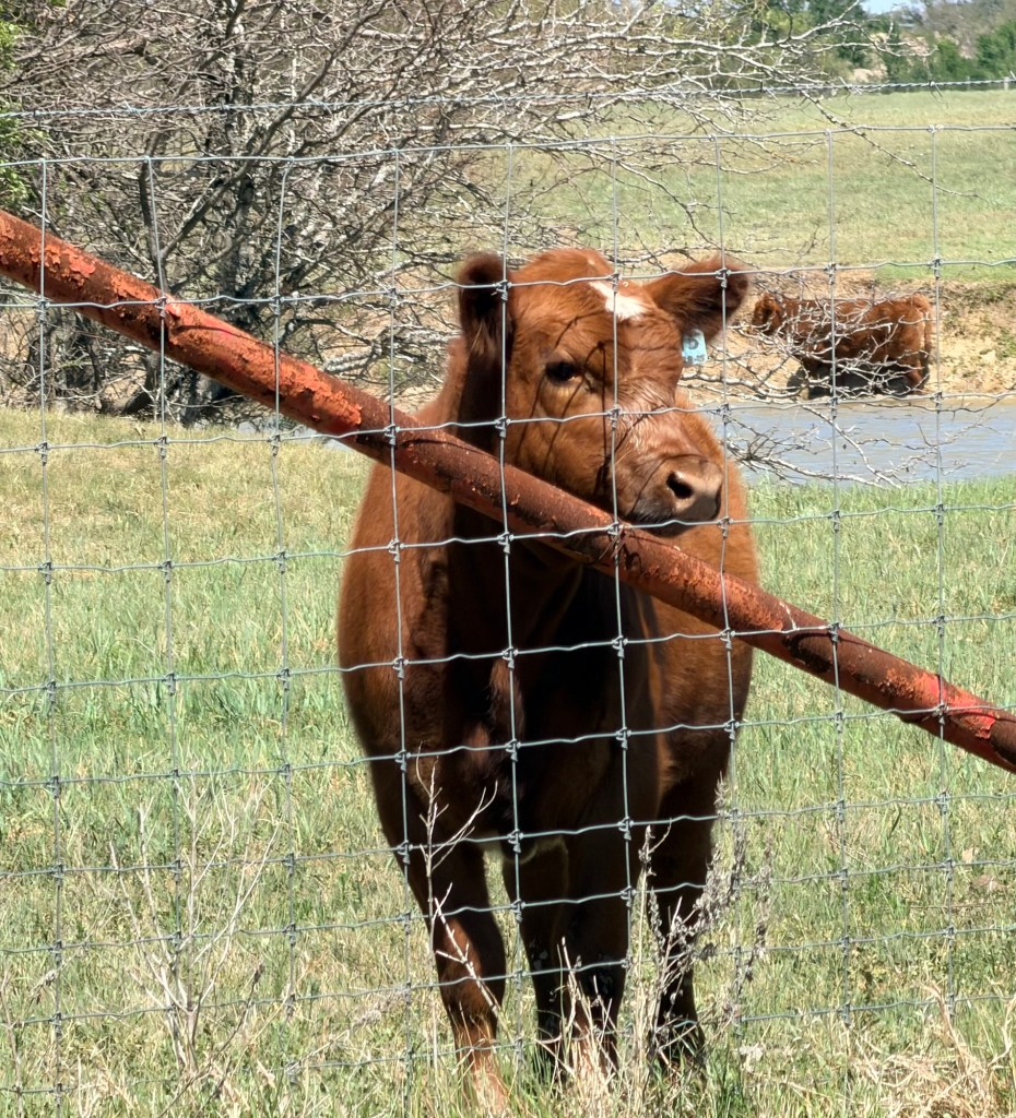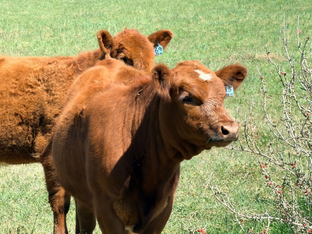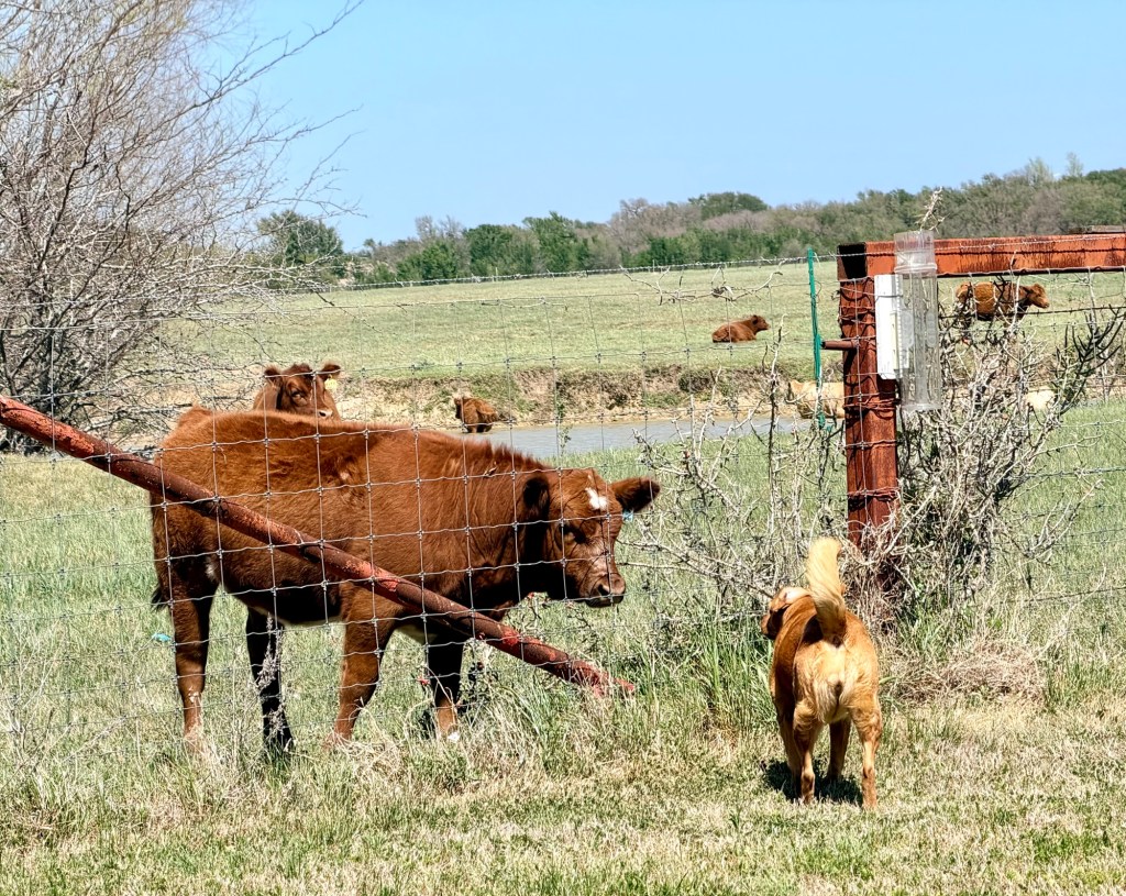 Calves! There are many cow-calf pairs in the field behind us right now. The babies are getting more adventurous and frisky, which is always entertaining. I love the brave and curious ones who try to get the dogs to play. This one with the white spot had a lot of fun with Penney and let me talk to her a while.
