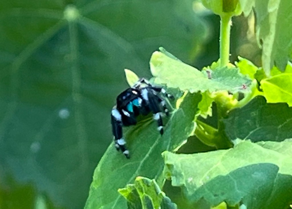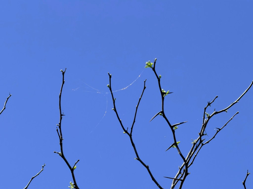 Funny things! I have two funny things to share. First happened yesterday. I went to the birding hut to re-start Merlin after it had been running a while. I wanted to write down the new species in my notebook but I couldn’t open it. That was odd. I finally peeled the pages apart, and I really perturbed a bold jumping spider who had managed to build a web nest in the book in just over an hour! I encouraged her to relocate.