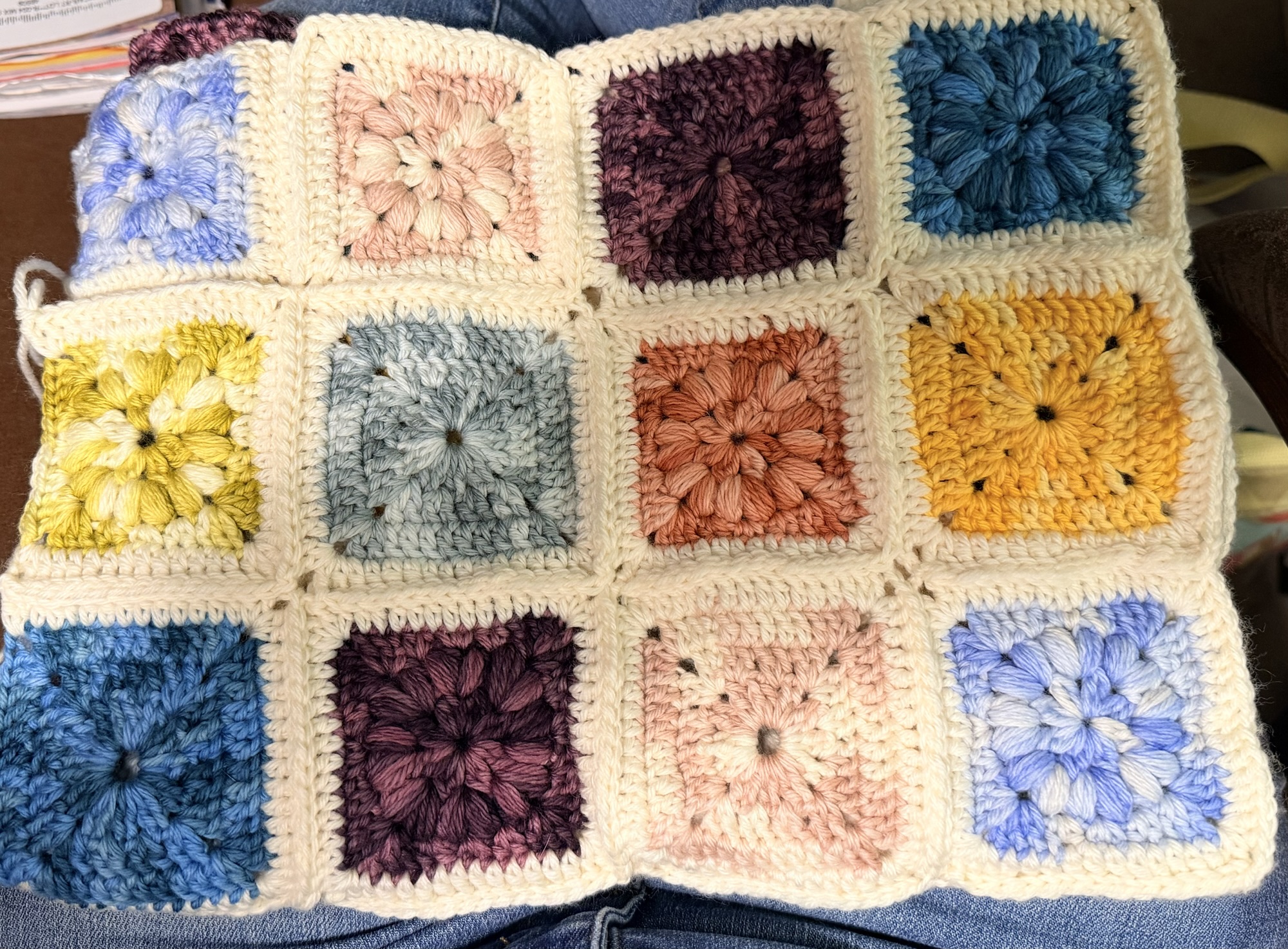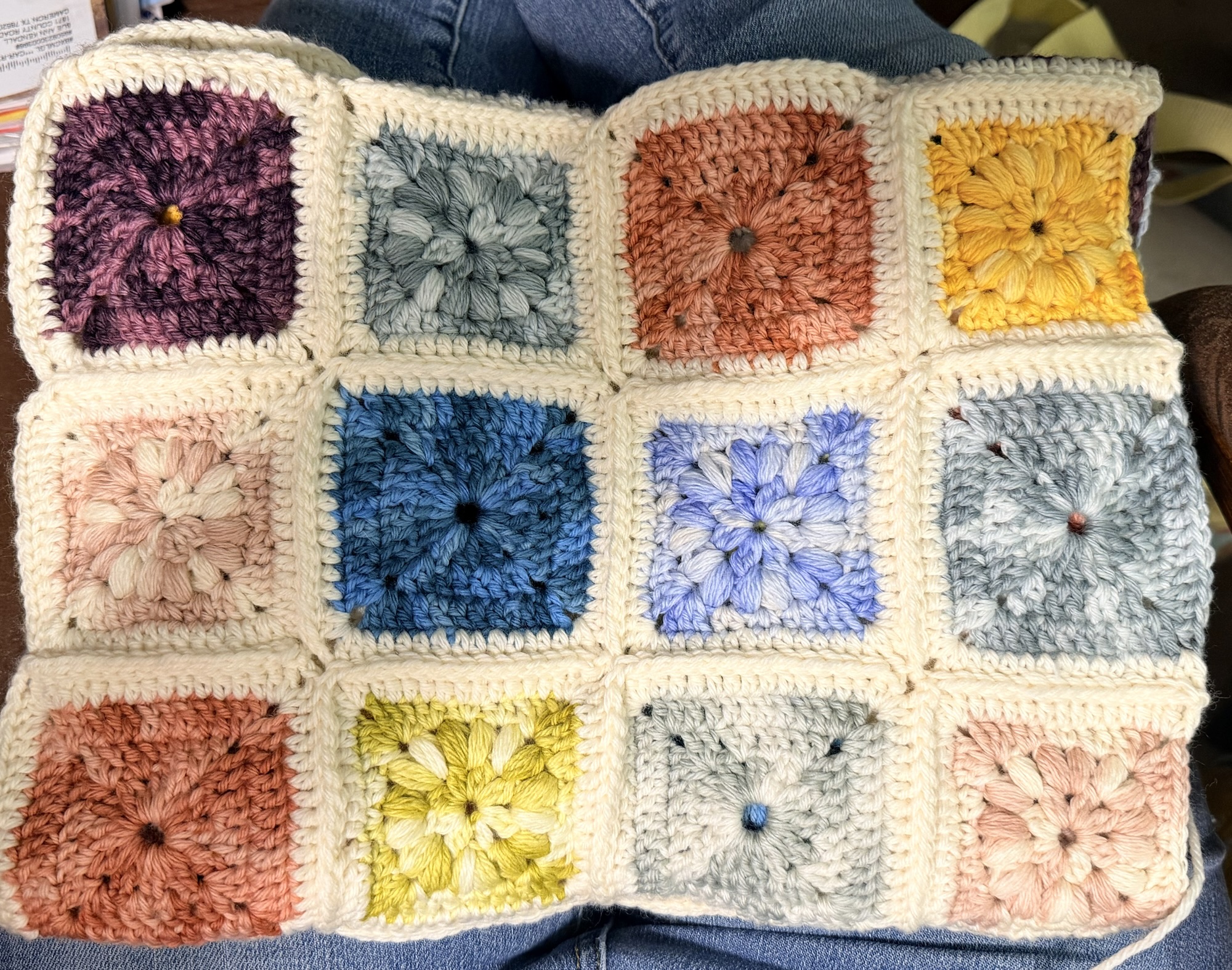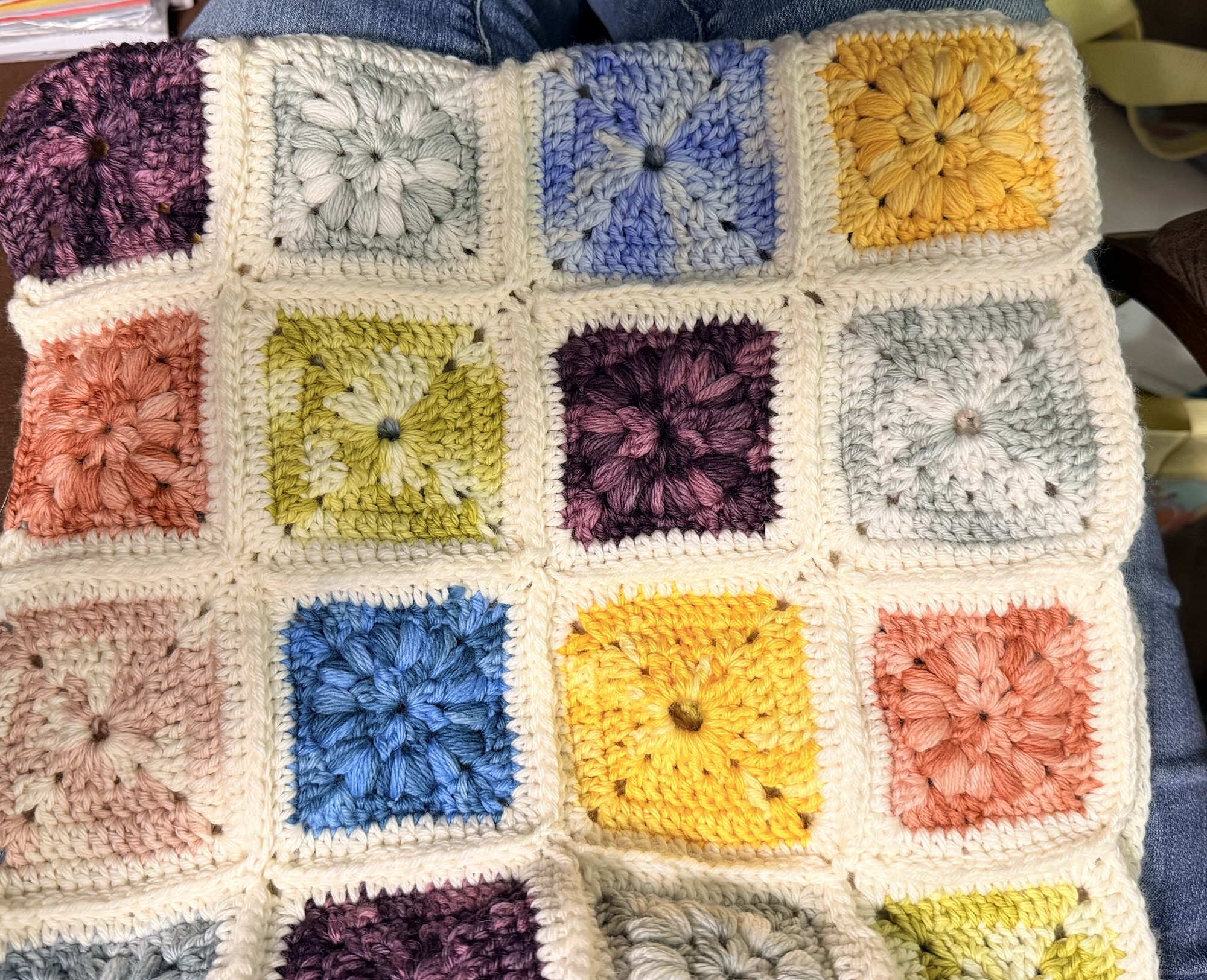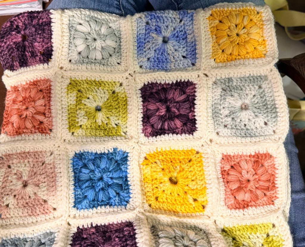 Crafts! We watched some television this afternoon and evening, which gave me time to work on my patchwork blanket. I got through all but one square on the fourth row. It looks pretty cute. I have some ideas for it once I join all the squares.