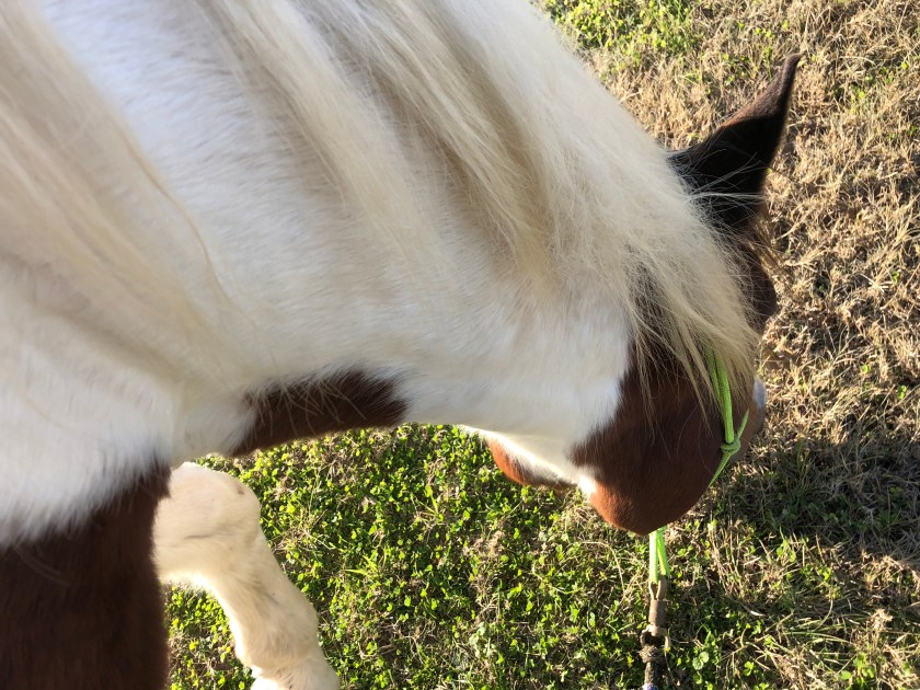 While we waited for her to arrive, Mandi and I groomed them all for the first time since all the rain started. Apache had a huge knot in his mane that took quite some time to remove and left him with a frizzy hairdo. Spice had something similar on her forelock. Fiona was just filthy.