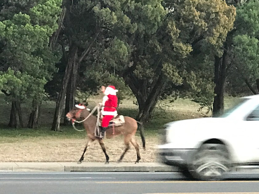 Anita and I were driving to our last haircut by our current hair person (she’s moving to Dripping Springs). Glancing up I saw the totally Austin spectacle of Santa riding a bay mule down South Congress.