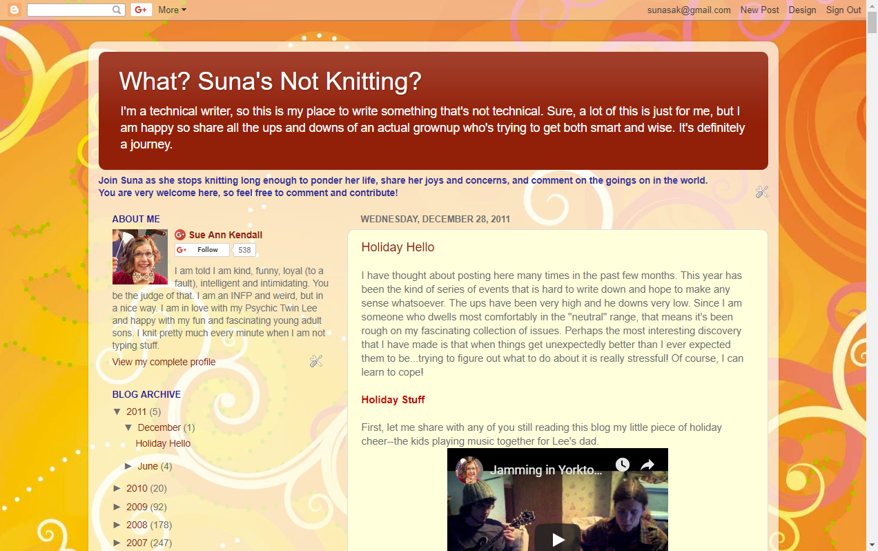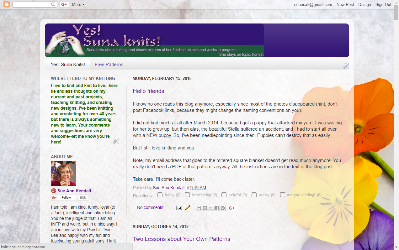 I really enjoyed keeping my knitting blog, but the knitter/blogger scene mostly died out when Ravelry , the online fiber community showed up. Now I just read the blogs of some of my professional knitter friends.