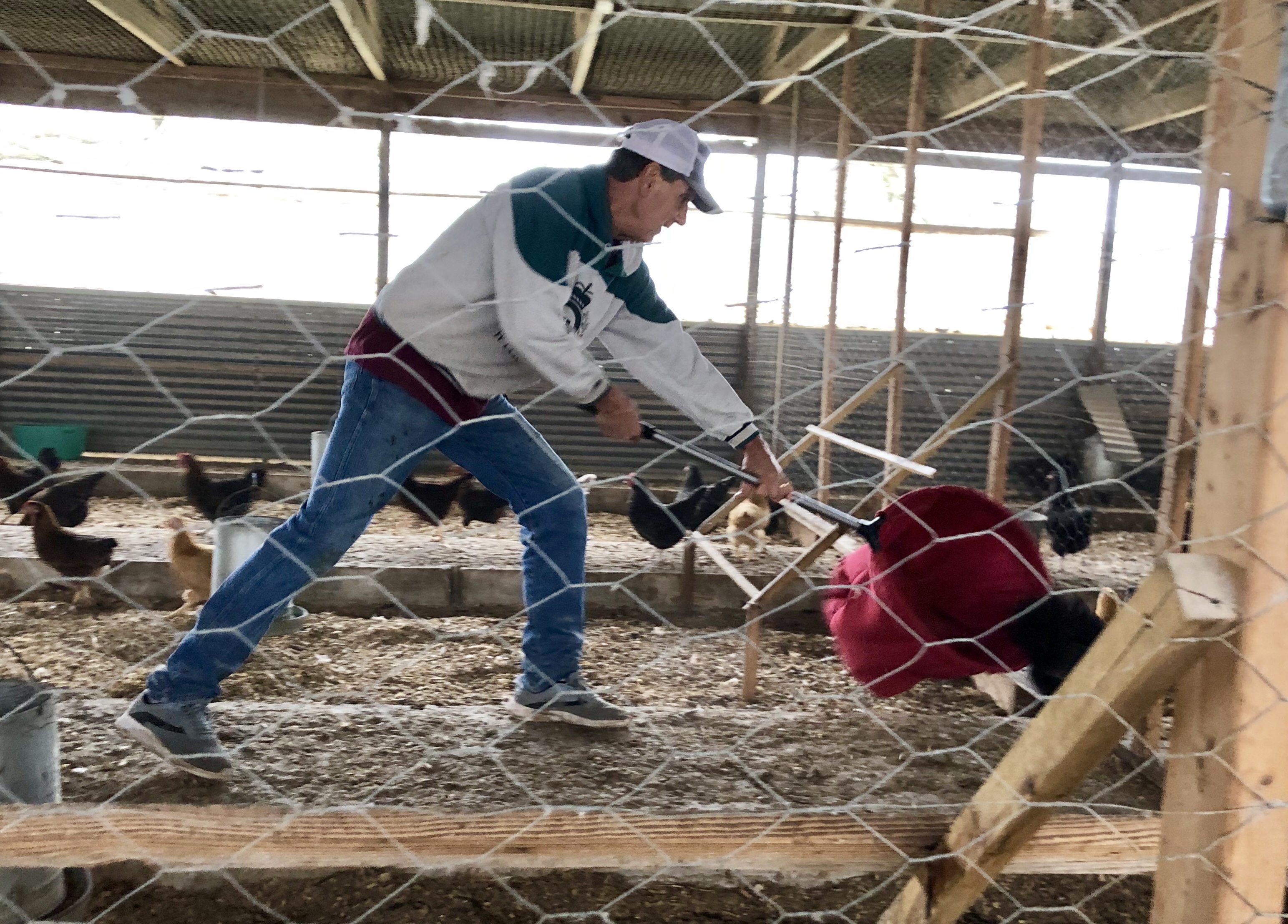 We lucked out and the 11 chickens we still had were out foraging for bugs, so they weren’t in the way. Mandi very carefully took each hen out, while Seth gave each one a little feed, so she would know she was home.
