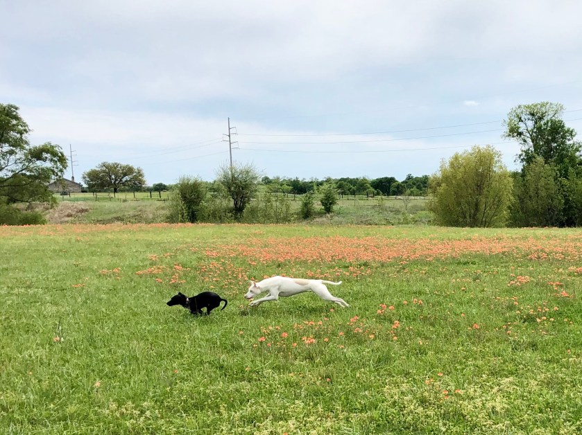 Bonus post! Lee wanted me to get some pictures of the dogs out in the Texas paintbrush flowers, and I didn’t argue much. They didn’t mind the chill in the air!
