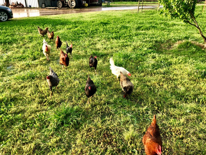 Of course, the chickens were glad to see me. They were damp, but they’d laid plenty of eggs! All the new chickens are producing, so we often get 9 eggs a day. That’s not bad, considering most of the hens are older.