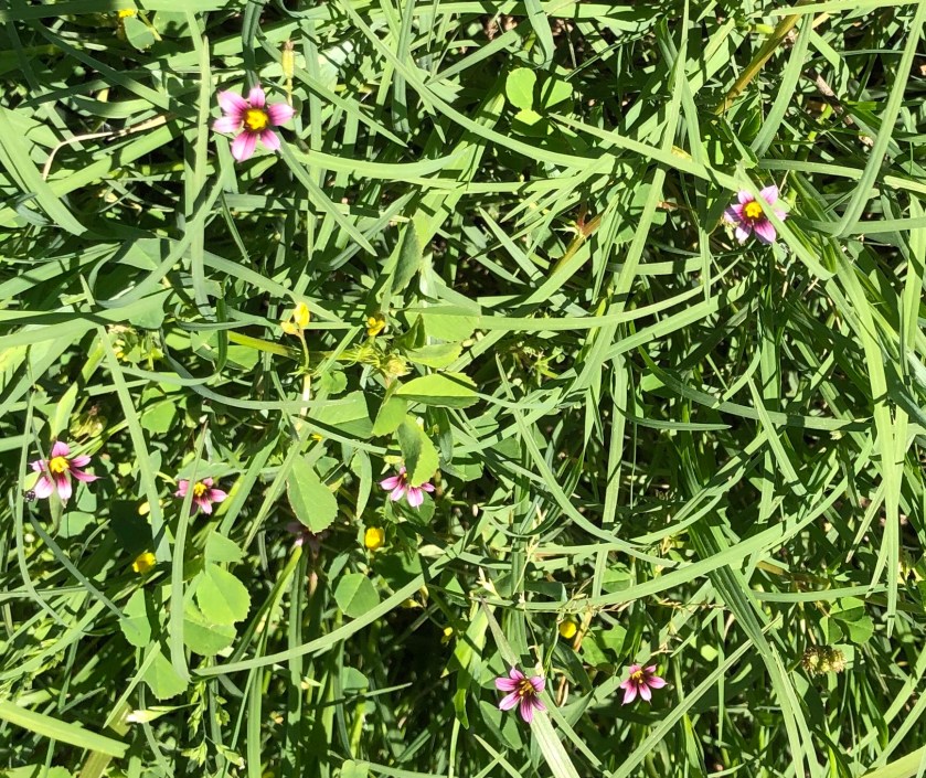 I also found two flowers I’d never seen before. One is a tiny flower that iNaturalist insists is a dwarf blue-eyed grass. It’s rather pink and hides in the grass, which may be why I missed it before. The regular blue-eyed grass is very showy, and a joy to see.