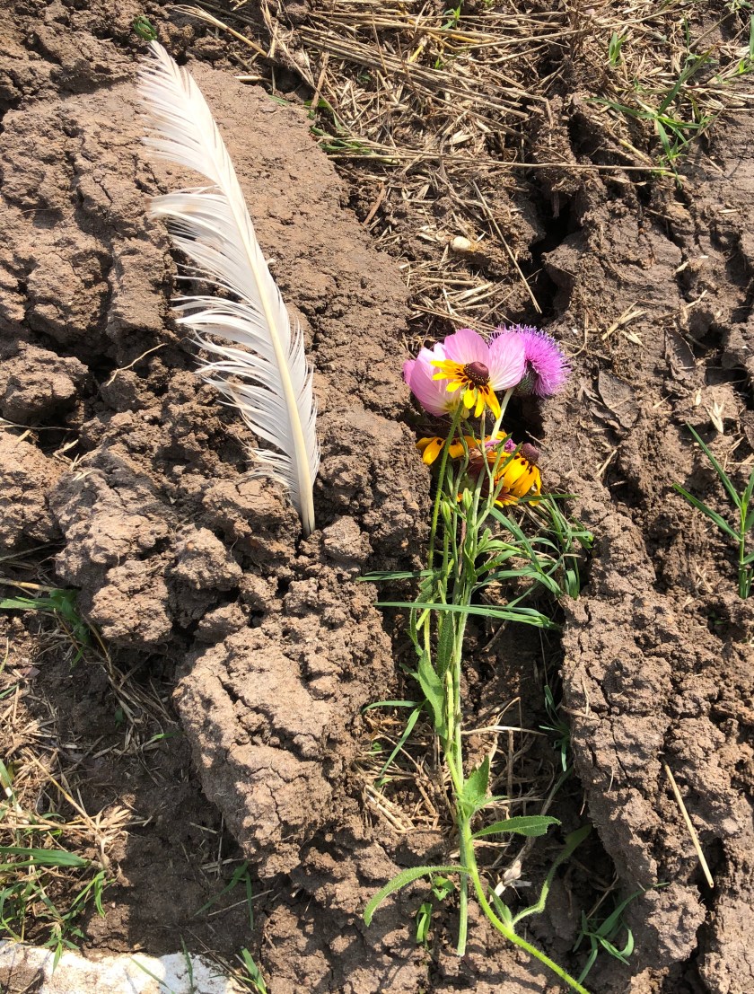 Maybe it’s that the spirits of all my animals are at the ranch. They comfort me. I left Brody some flowers and a feather.