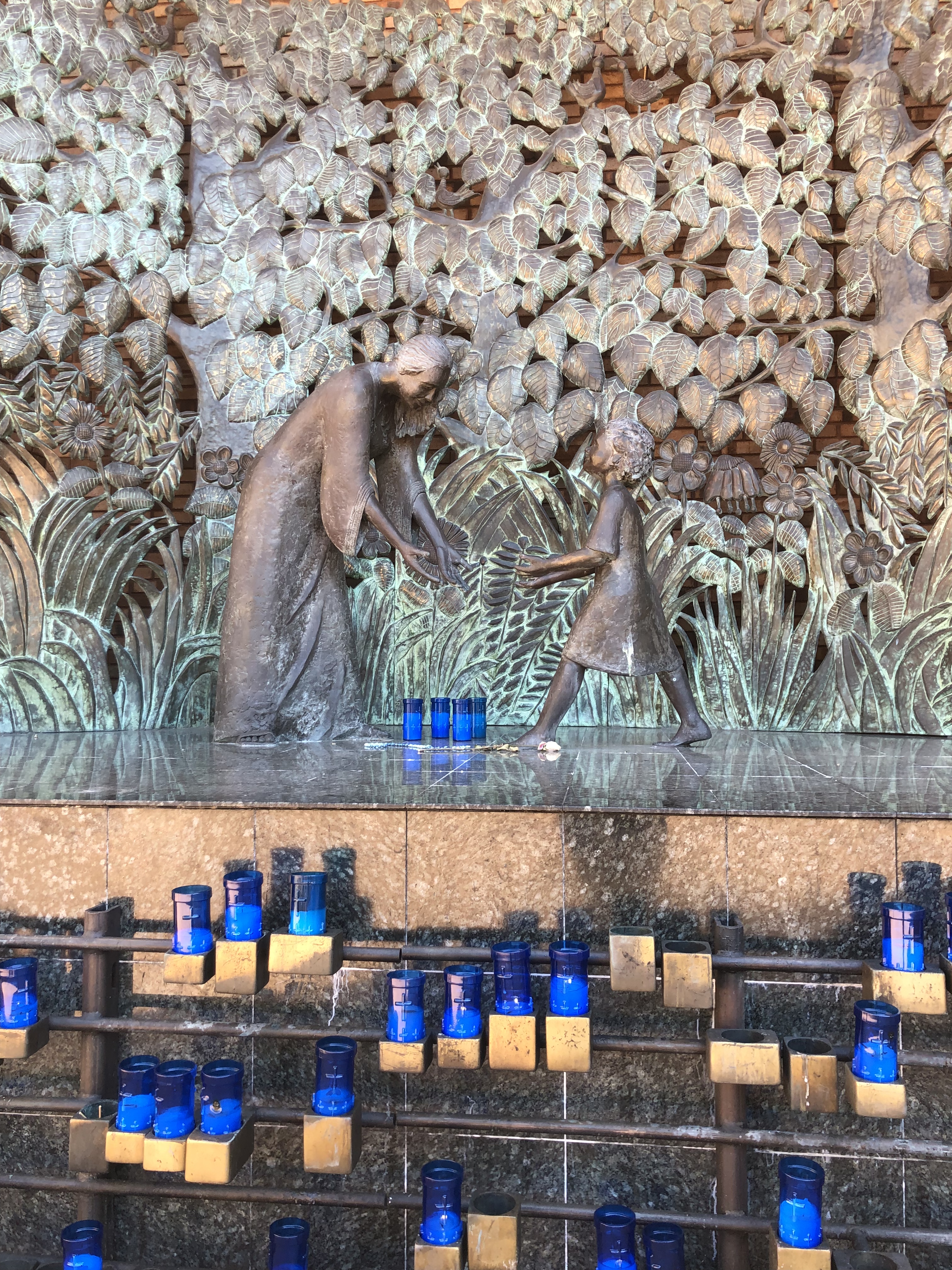 Then we were drawn to the Mother and Child chapel, and it was so pretty (and covered with donor names). The statue is of Mary and Jesus as a young child, which you don’t see often. I thought it was really sweet. And, I lit a candle for reuniting with one of my children and continued improvement for the other one. Why not.