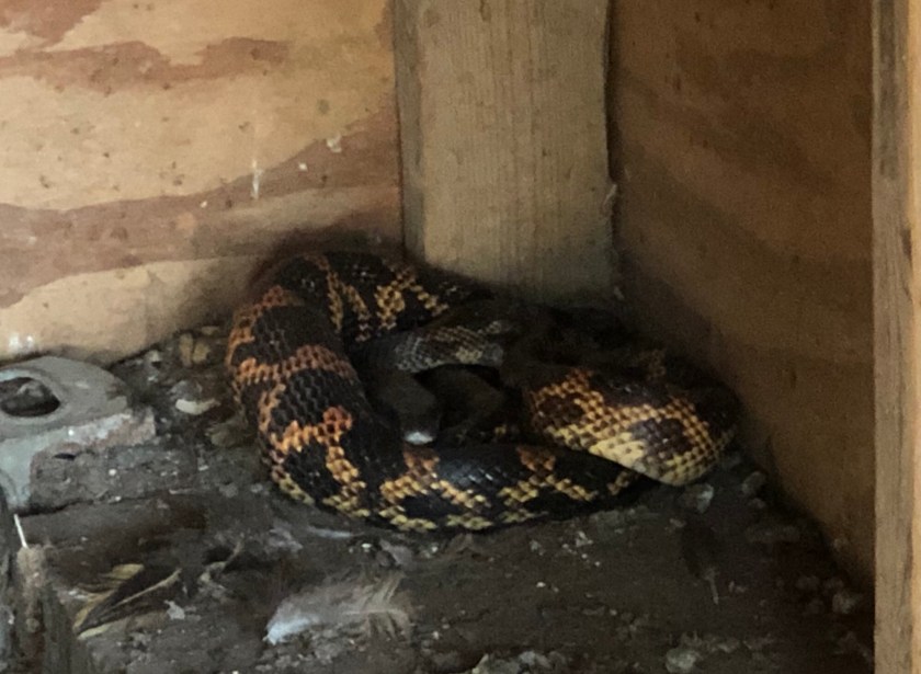 Today there were no eggs in the henhouse. Because I was suspicious, I entered carefully. I saw this very satisfied coil of sated slitherer:
