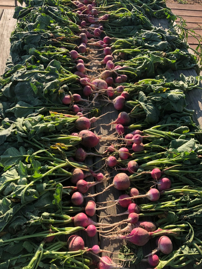 His first big harvest is all these radishes. Aren’t they beautiful? I’m going to make some “radish slaw” tomorrow. If I have extra, I might try some of the recipes I’ve been seeing that feature cooked radishes.