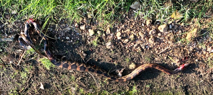 So, Tyler got a pistol and disposed of our uninvited guest. There were three large egg-shaped lumps right in the middle of the snack-loving snake.