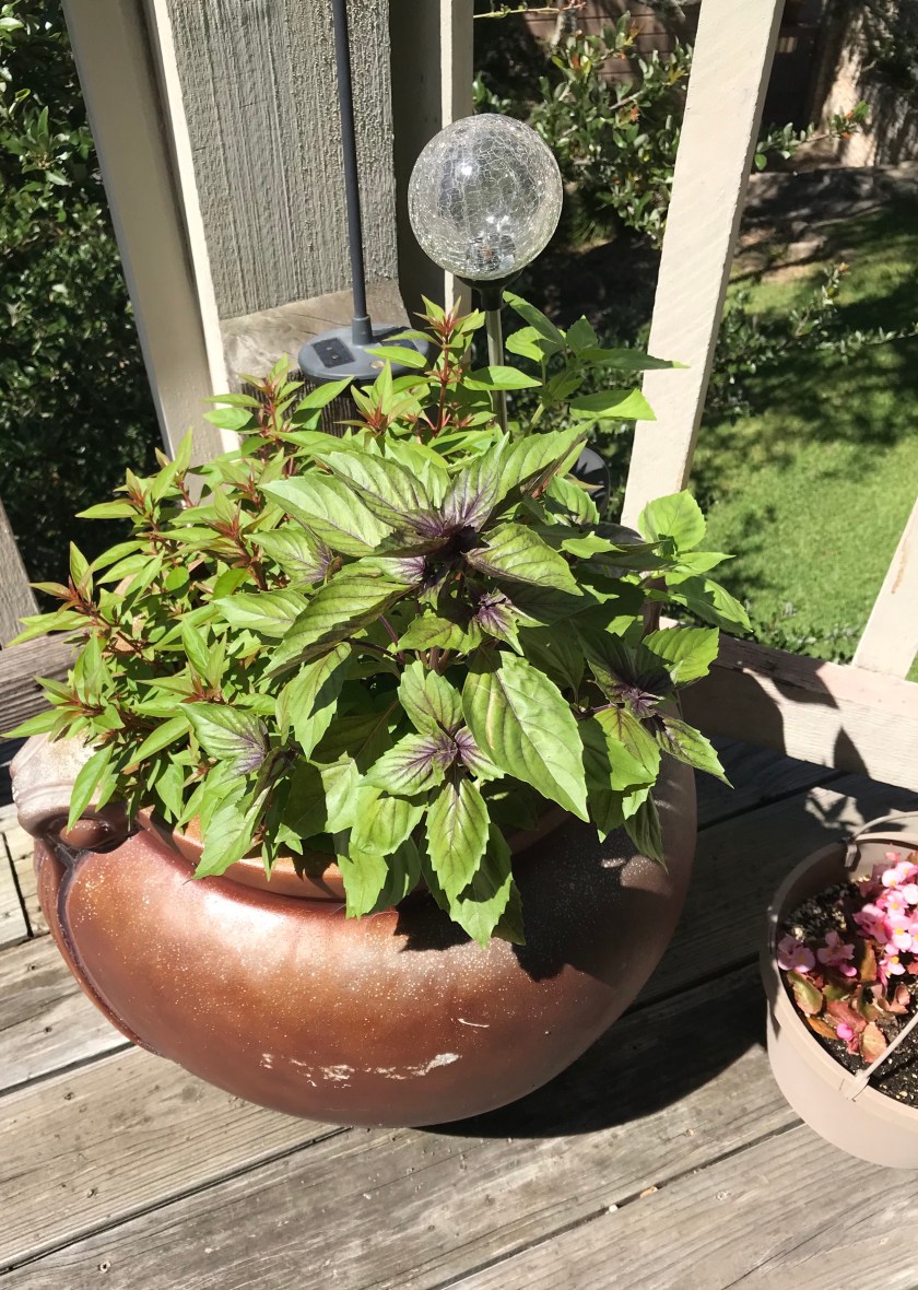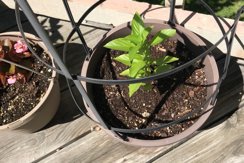 And finally, the seeds I planted last year in a big pot surprised me. They had died down over the winter, but came back! Also the basil that was in there reproduced, too. Heck, it even had a baby in an empty pot!