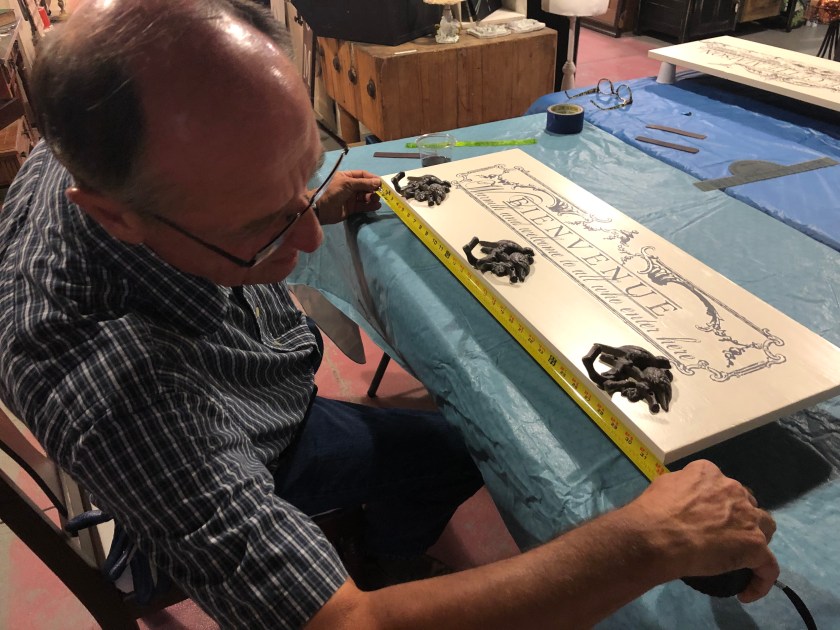 So, I showed up last night, and got to hang out with Pat, the owner, two classmates who were her friends, and Path’s husband, Mike. Mike did all the drilling of holes for us. Apparently, he repurposes furniture for his job, so he knows this stuff.