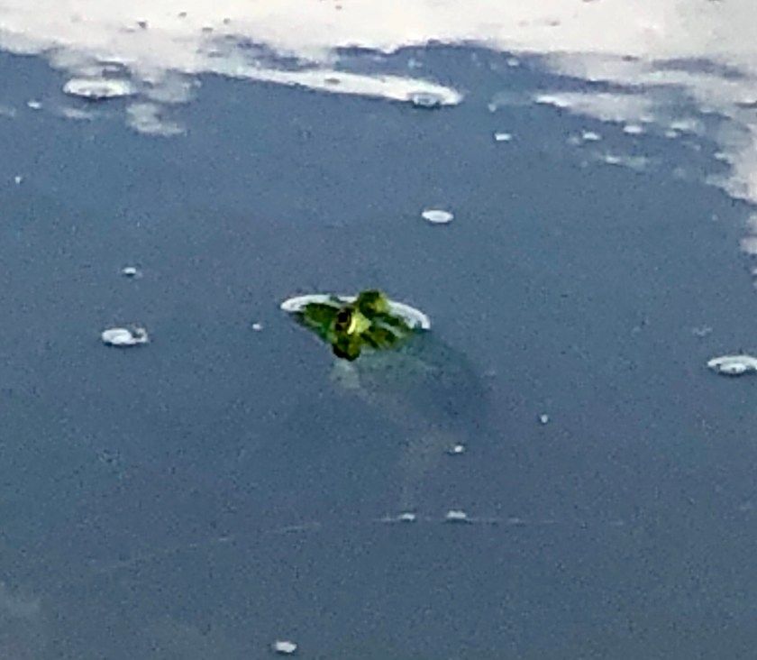 Careful observation and standing still a while brought the delightful realization that heads were poking up out of the water! The first head was of a small brown frog or toad, about four inches long. It suddenly snapped up a flying bug (scaring the bejeezus out of me) and disappeared.