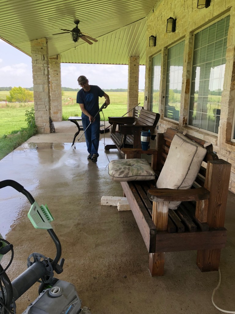 While he cleaned out the grill (including bird nest, of course, birds love grills), I power washed the “outdoor room” area, which is secretly a vortex for dog hair and dead bugs. Luckily I’d swept it out recently, so it wasn’t too bad.