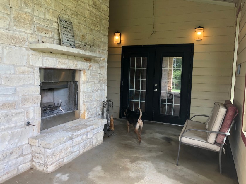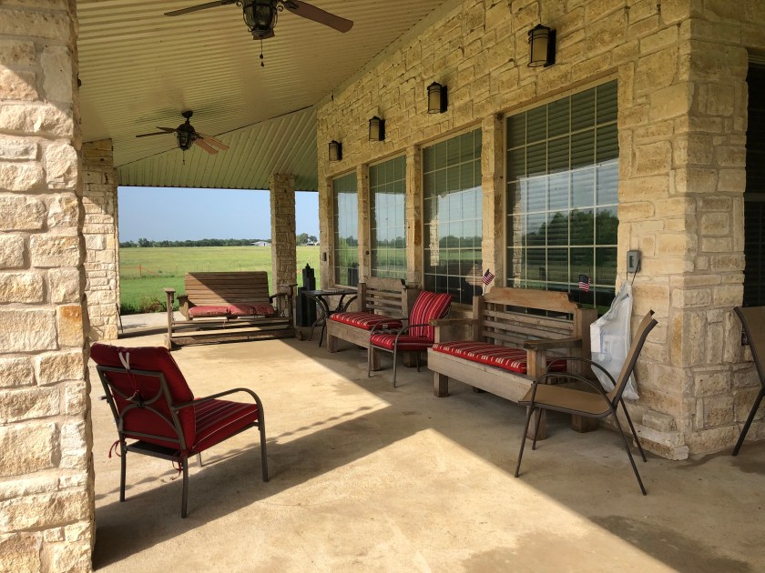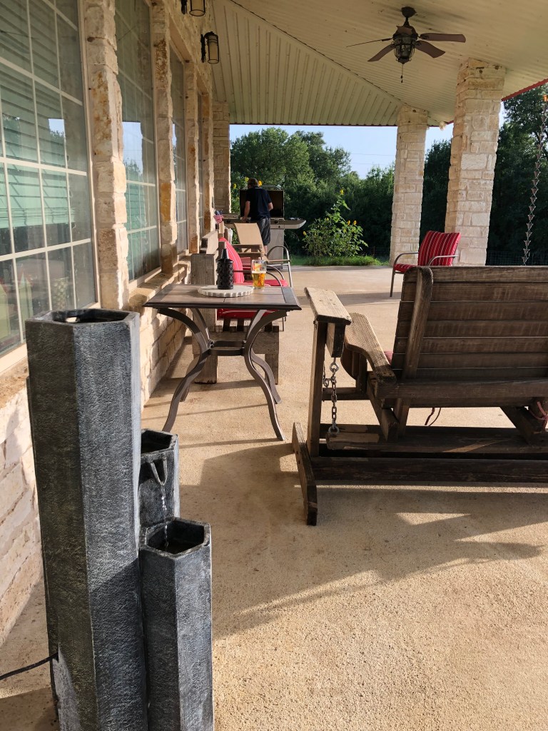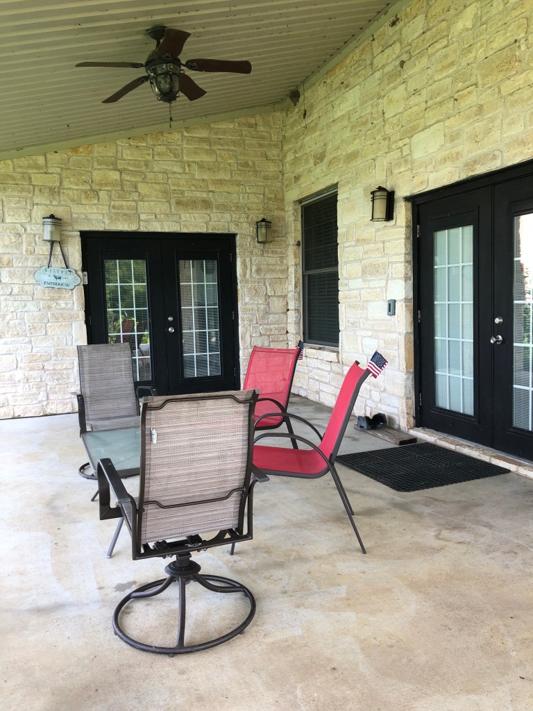 While we were at it, we got our little water fountain up and running, too (it had a rusted out tiki torch in it, which was yucky). By the time all that was over, I was a tad over-heated, but I made it, and am really proud of the hard work (and Lee did the worst part, the corner where all the birds nests and June bugs combined to make an ugly mess. I am glad I didn’t take “before” pictures. Ranches have a lot of things that like to make porches look disgusting.