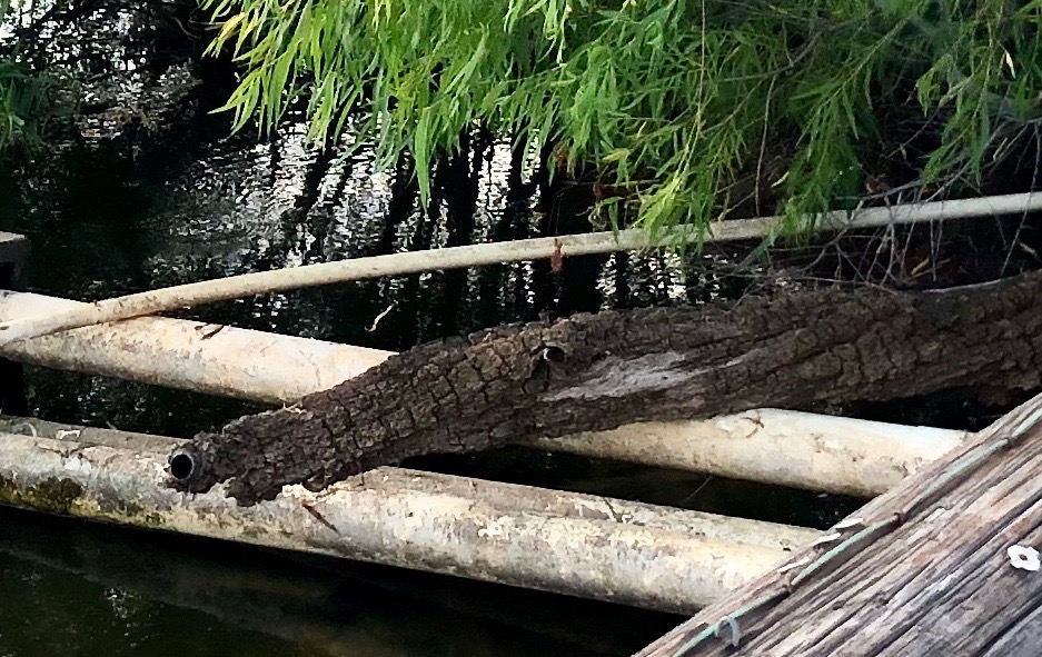 I mostly toted smelly bait back and forth and helped in other ways, since there were only two good fishing poles. I took lots of photos of minnows, my horse, trees, and such, plus this scary alligator, who is really a log.