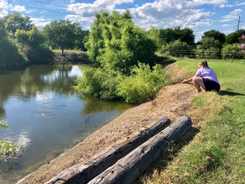 Mandi is officially on vacation, so she wants to have some outdoor fun. I accompanied Mandi and her son, Matthew, over to the pond behind Ralph and Sara’s to do some fishing. Of course, it was 100 degrees out there. But, we persevered. The pond is stocked, so we know there are good fish in it, but it’s so pretty and relaxing, that I didn’t care.