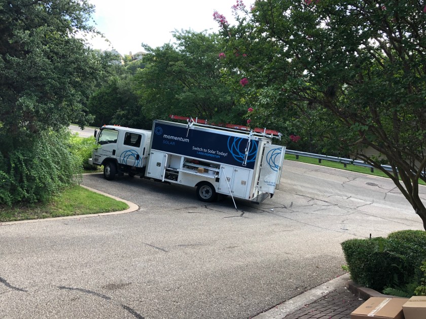 By the time I got home from work, they were wrapping up. Anita and I walked all over the place, but could only see a couple of panels through the trees from the swimming pool area. I don’t think anyone in the neighborhood can see them, which should please Bronson and the HOA Board gang. I’m guessing the fancy houses off Far West on Mabry’s Ridge will be able to see the eastern panels, but they don’t look bad at all, so no worries.
