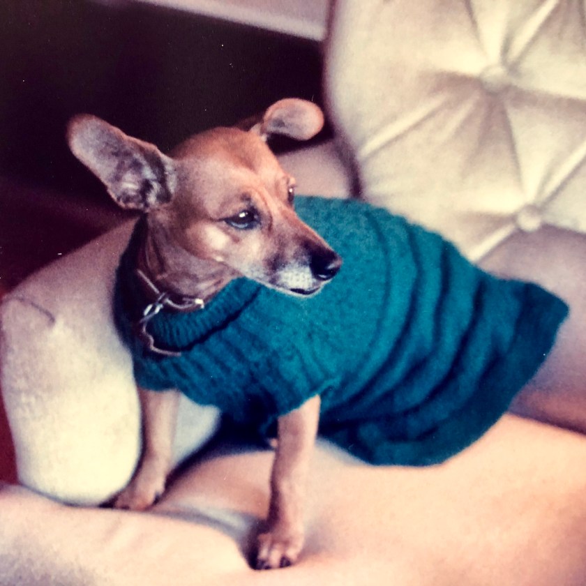 But much of the time we had fun, which is why I include this great picture of Pumpkin, my first dachshund mix, wearing a sweater I knitted for her. Doesn’t she look spiffy?