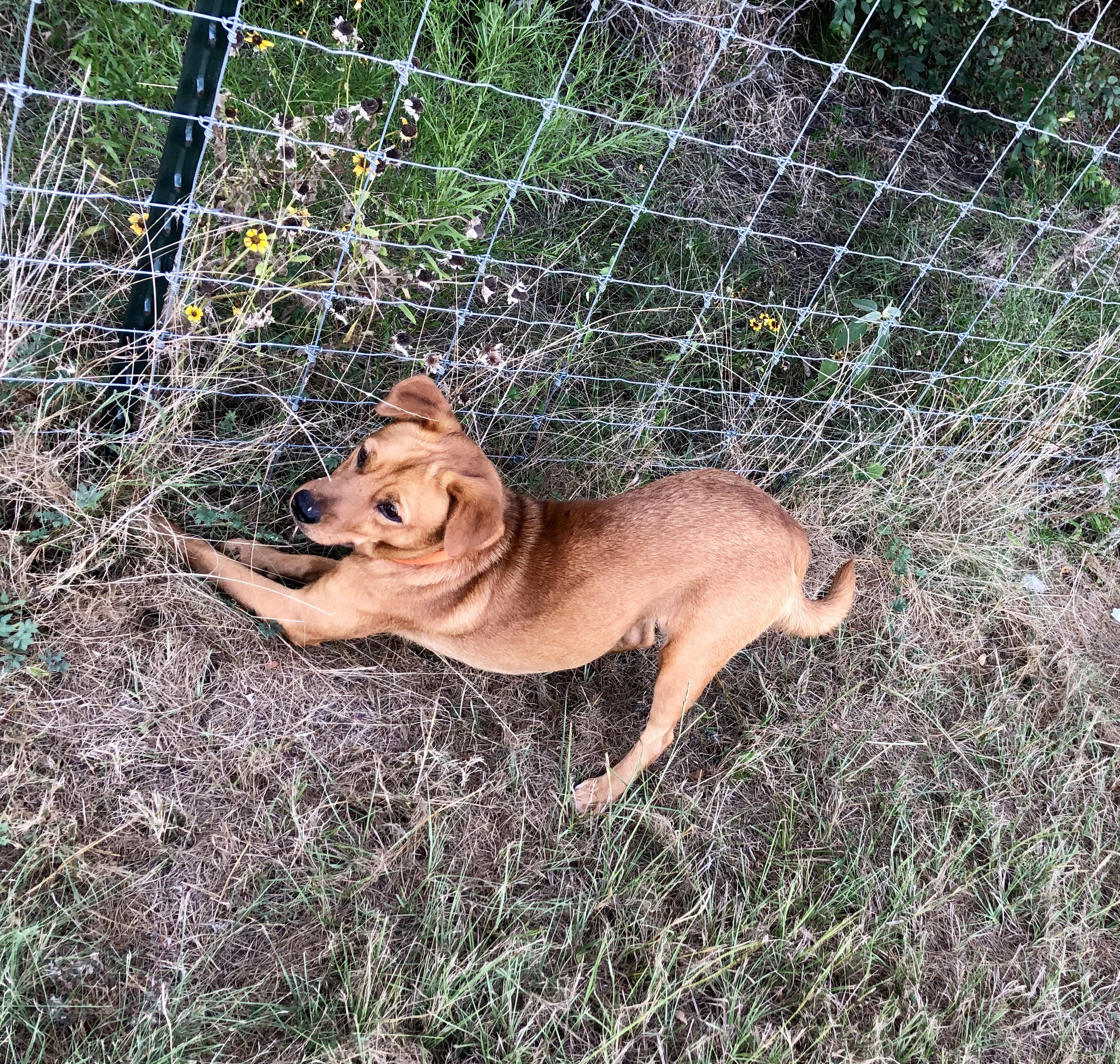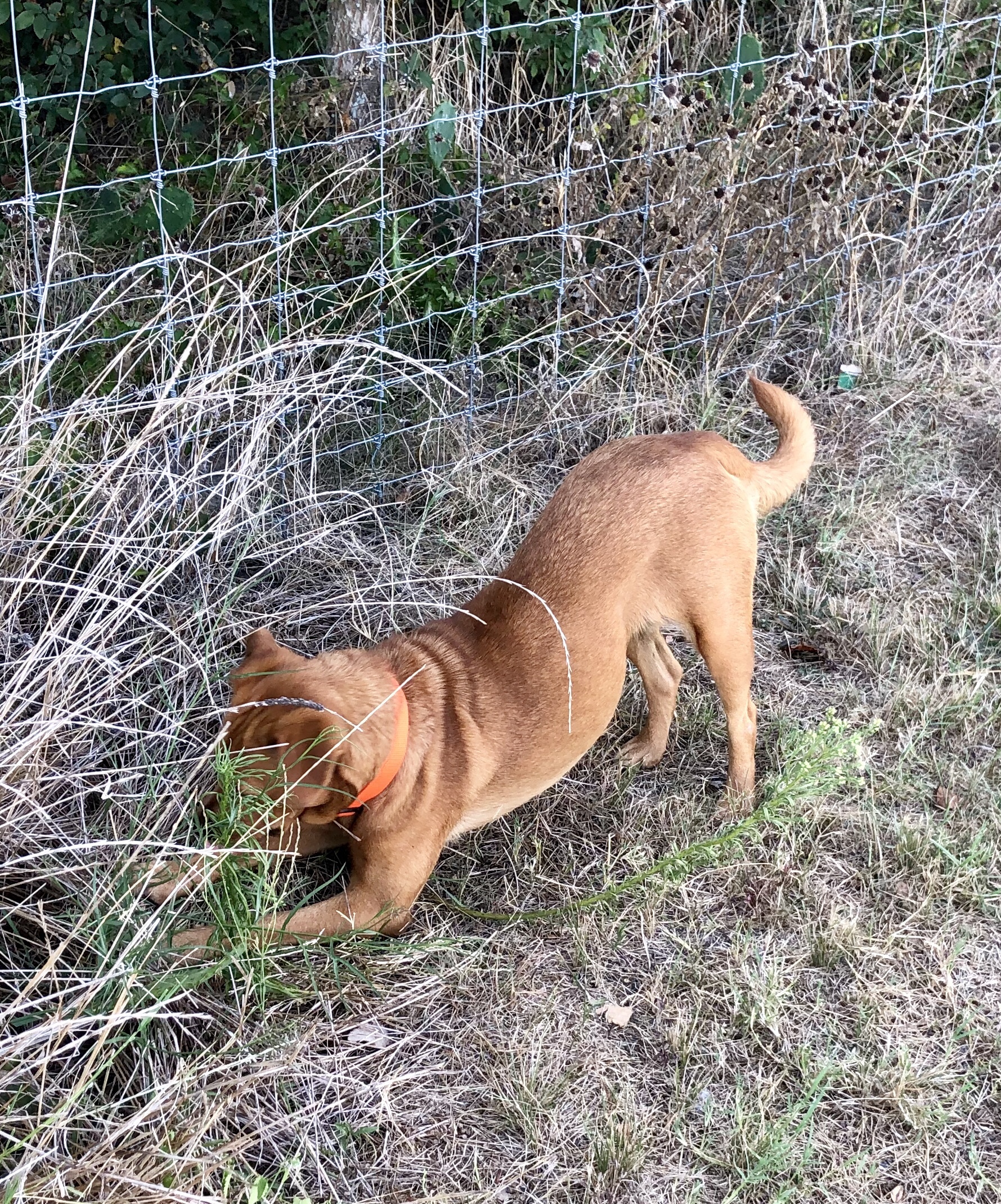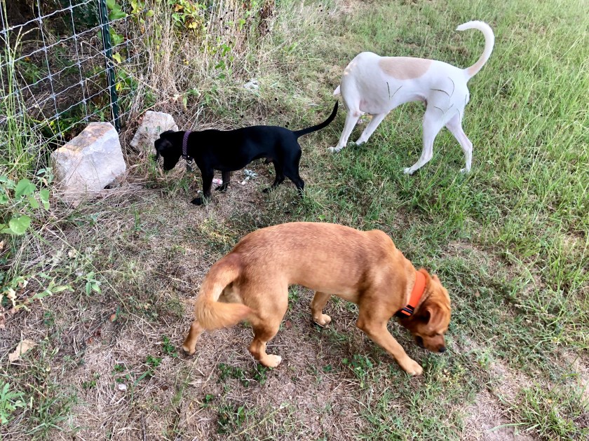I spent as much of the day outside as I could, given the extreme heat, so Penney could get to know her surroundings. In the later part of the afternoon, she, Vlassic, Carlton and I explored the perimeter of our fenced-in back yard area, and she showed her fun side by pouncing on grasshoppers and smelling all the unfamiliar plants.