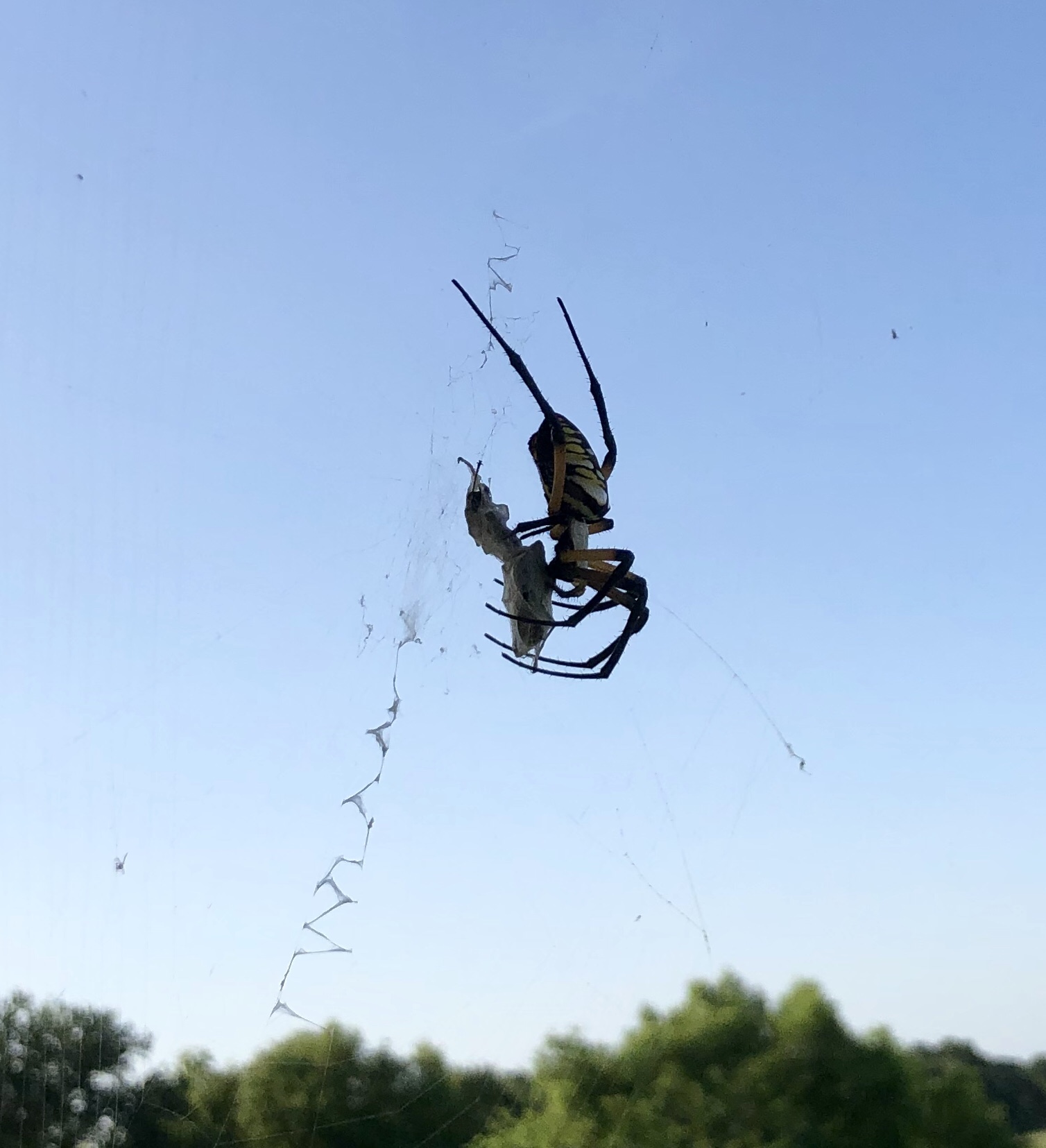 I’d been meaning to get a photo of the cool web over at our weather station, and the photography gods were with me this afternoon and allowed me to get a pretty good shot of it. There’s some wind damage, but it’s been holding up for weeks now (I don’t know what kind of spider lives there). there).