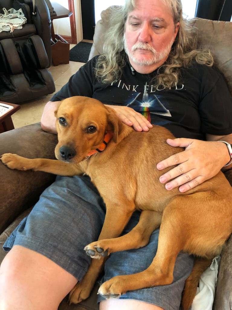 Penney weighs 30 pounds, which once again proves she’s the ideal dog, ha ha. We wonder if she’ll gain weight after being spayed. We tried really hard to get Carlton in the trailer to weigh him, but he was having nothing of it. After running around in 102 degree heat and getting bashed so hard by his head on my right index fingernail that it still hurts today, I gave up, and so did the vet tech. He won. I’d still like to know.
