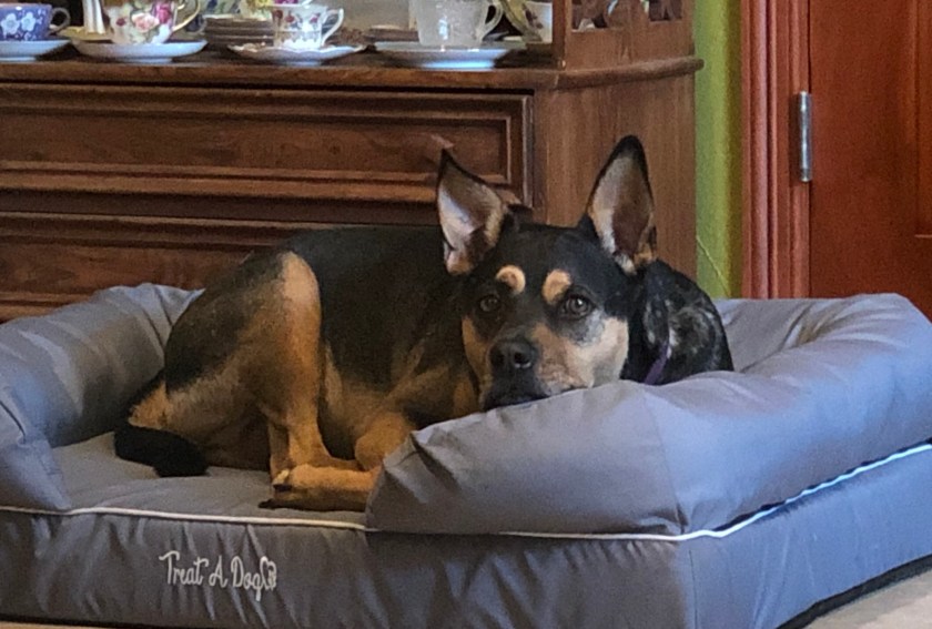 In other areas, Harvey has really calmed down in the last few months and isn’t as growly and grouchy. He likes to find new places to sleep, like the dog bed in the den. What? An actual dog bed for sleeping? Yes, they like the one Lee Ann and Russ gave us.