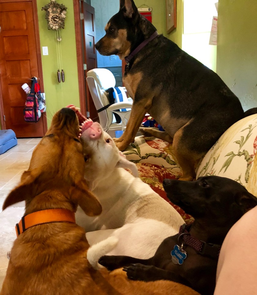 I think that’s getting better, though, because they have all been in my den on the couch playing away (I had intended to take a nap, but instead I took pictures of the smaller dogs all playing together indoors).