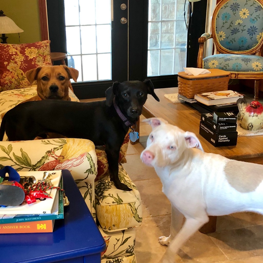 It’s been a bit more relaxing than usual around here, so we’ve been hanging out with our precious canines. I’m relieved to say that they are all getting along really well. The worst behavior issue is that Vlassic has been avoiding the family room ever since Penney arrived and lashed out at him when he wanted to share a lap with her.