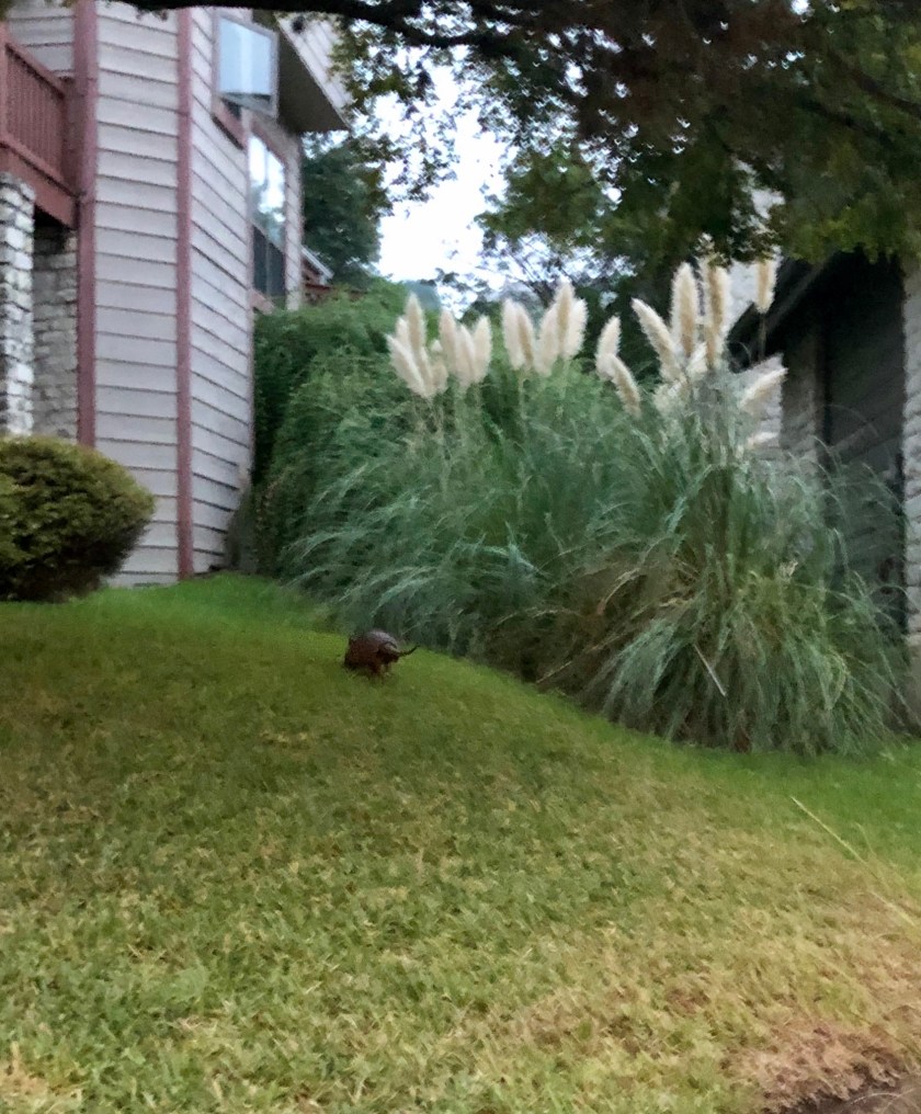 Once it noticed us, it moved to the grass, and just looked at us for a while. Vlassic looked at the armadillo and it looked at him.