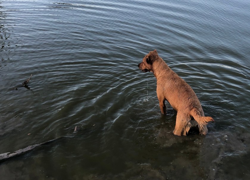 However, the banks are very deep mud mixed with poop from fish, turtles, eeping frogs (which Kathleen got to see and hear go “eep” when they jump in for the first time), and cattle. The dogs certainly did NOT end up “clean.”