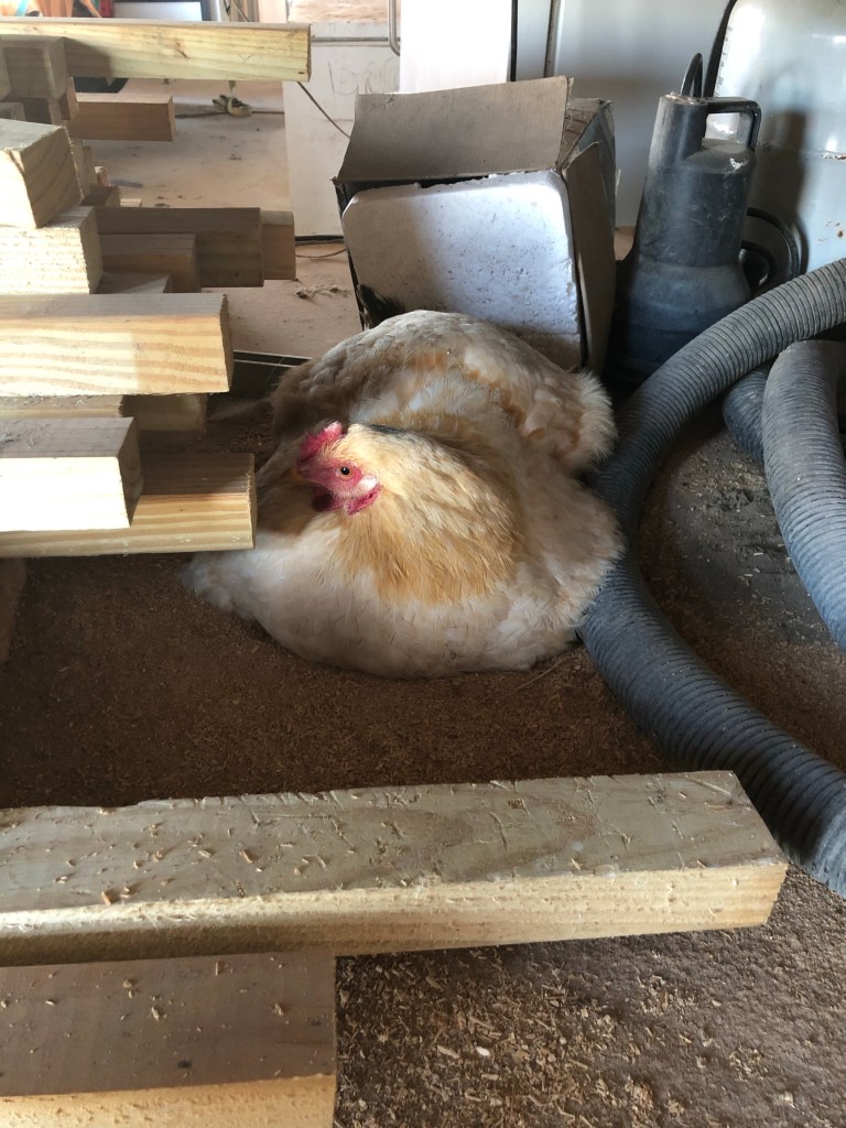 She was sitting on EIGHT pretty pinkish-brown eggs. That’s one a day since I last checked. My goodness, that’s a broody hen! And being my sweet Buffy, she let me take them all out from under her without a bit of complaint. She’s just the best danged chicken. I hope she hangs on for a few more weeks until the new coop is done!