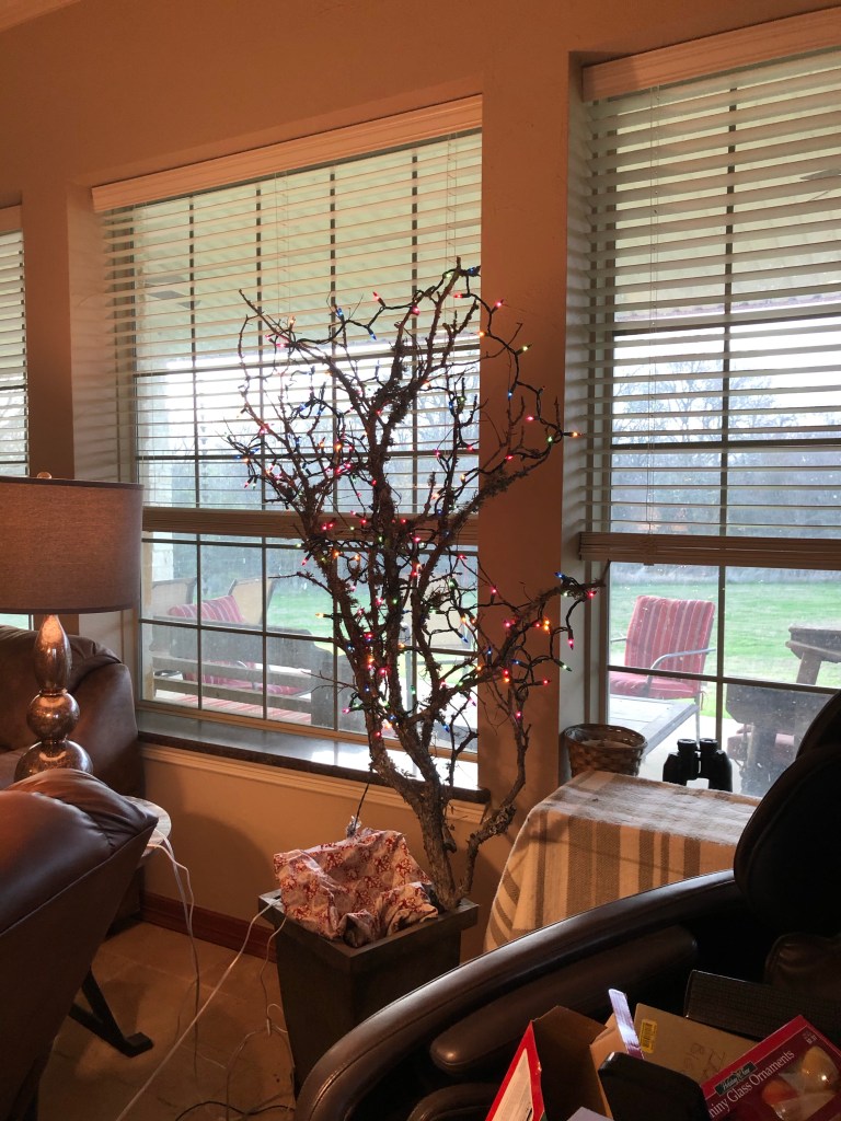 When I got home to the Hermits’ Rest, I focused on outdoor things. Kathleen and I re-used many decorations yesterday to brighten up the ranch. As we did that, I assessed our tree situation. The bare-branched “nature tree” we keep up all year around finally quit lighting up, so it really can’t be a Christmas tree this year. It lasted many years, since we first started building the house, so I can’t be too upset with it.