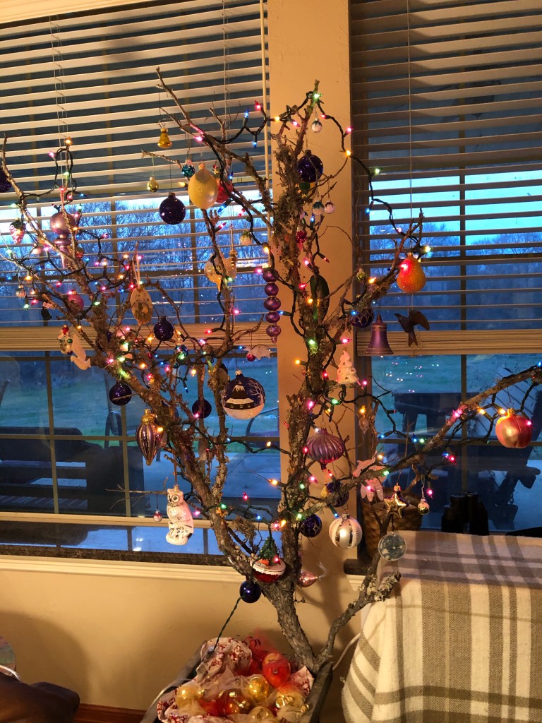 Fine, I thought, we’ll do without. Then I remembered that decoration back in Austin. Hey, there’s a woods over there. I bet there are fallen branches that might work as a “tree” this year.