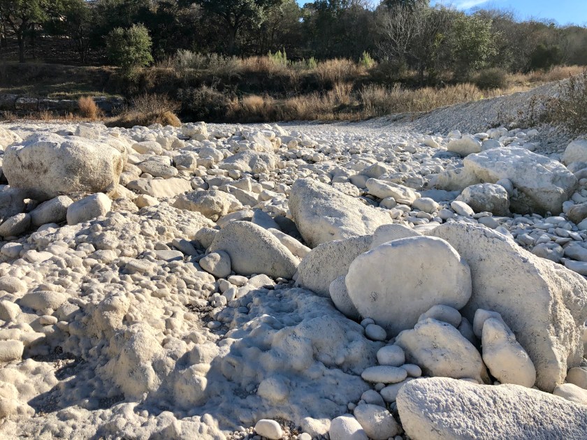 I headed back down to the river where I saw all the armadillo munching away yesterday. I only saw one today, but that’s because I walked through the river. The bed is glaringly white, since it consists of polished limestone with a layer of white sediment on top of it. It’s positively lunar.