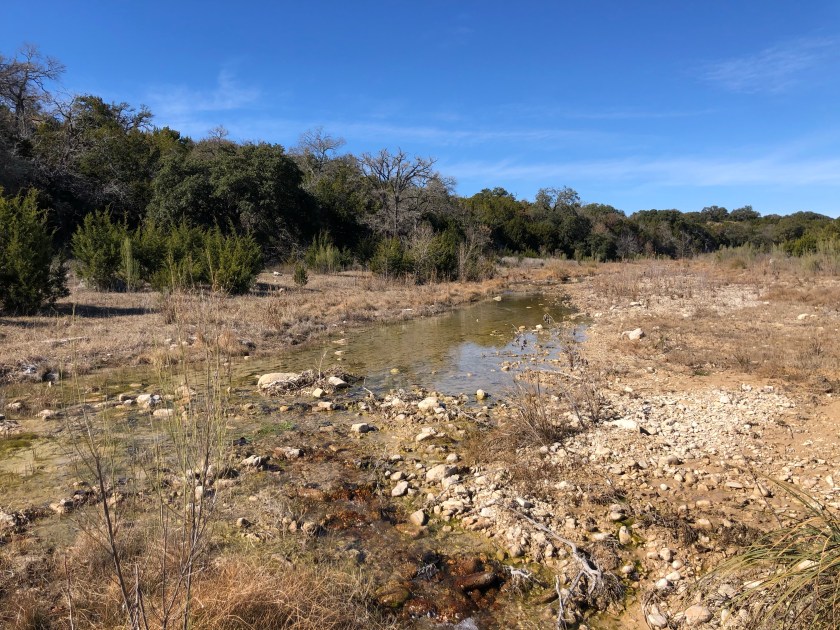 I found out that right through here, the river and the creek both head underground for a while, and flow through an aquifer, later to emerge to the surface. Aha! That all makes sense. When there is a good amount of rainfall, both the creek and the river also flow above the ground.