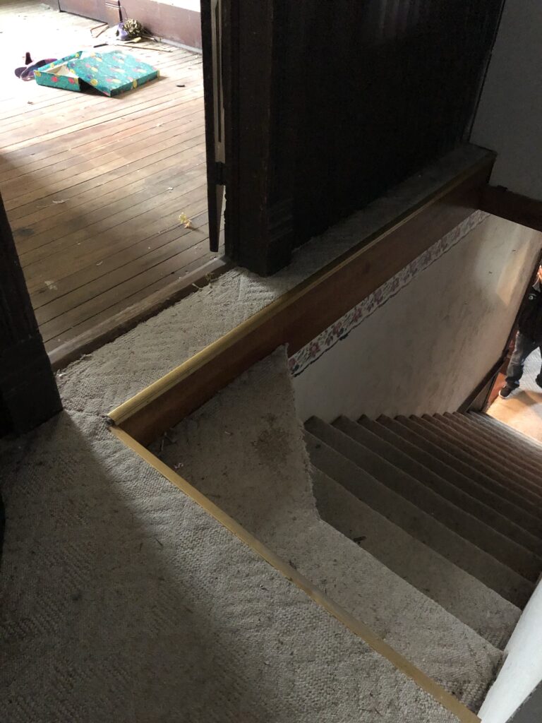 Many changes had happened to the house over 115 years, and when we got it, there was a lot of paneling, wallpaper, and interesting interior changes. The biggest change was when the previous owners hired a contractor to install a staircase. It wasn’t exactly safe. (The house had an exterior staircase, since the upstairs started out as a home and the downstairs a doctor’s office, then a boarding house for many years.)