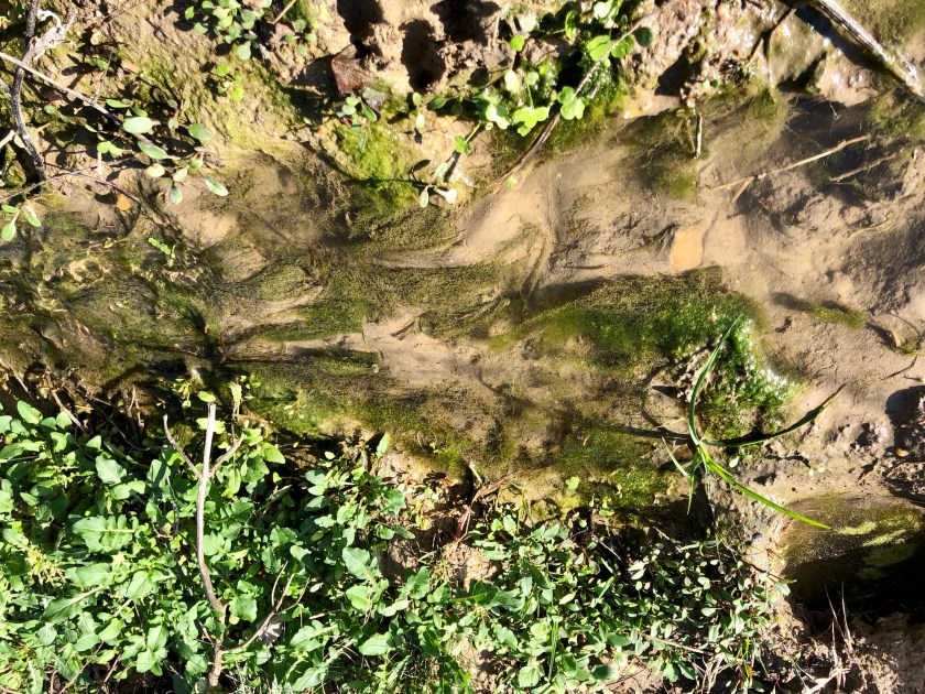 Finally we scratched our way through the various sticky plants until we got to the muddy spring area. Maybe I’ll name it Muddy Springs; it’s descriptive. I could see two areas where it bubbled up out of the ground, among all the cow footprints. There is lots of moss and pretty green plants in the moist area. Unfortunately, I can’t figure out what any of them are, even with iNaturalist.