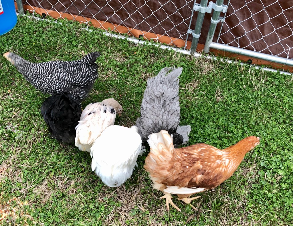 I checked on them after sunset, and they were settling down. Five of them were sitting on the branch Chris and I found for them. One, Elsie, had found the nest boxes and was comfy in there.