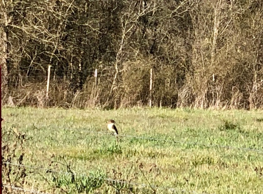 I made it to the horse area, where Sara and I warmed the horses up, then saddled up for a ride. I practiced not using my reins, in preparation for using a bit with Apache. I used a stick to direct him. It went well until he got tired of it and marched off to where he wanted to go. Once that was dealt with, we toodled down the race (long fenced path to the far pasture) so we could ride around in the bottom (the beautiful area that floods in bad weather).