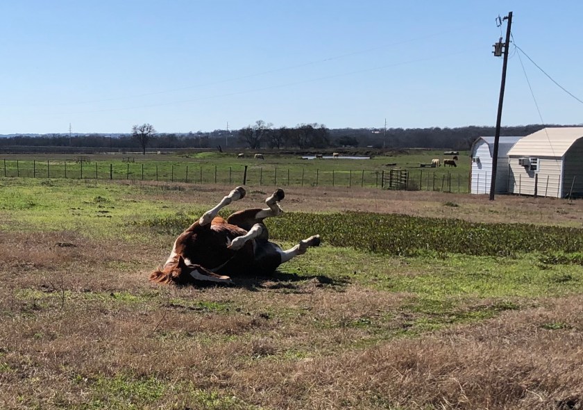 Nicole and Easton visited (they are moving nearby in Temple soon) in the evening, and they wanted to see the horses, so we all walked back to the corral. On the way, we noticed a cow laying like she was dead. We decided she was in labor.