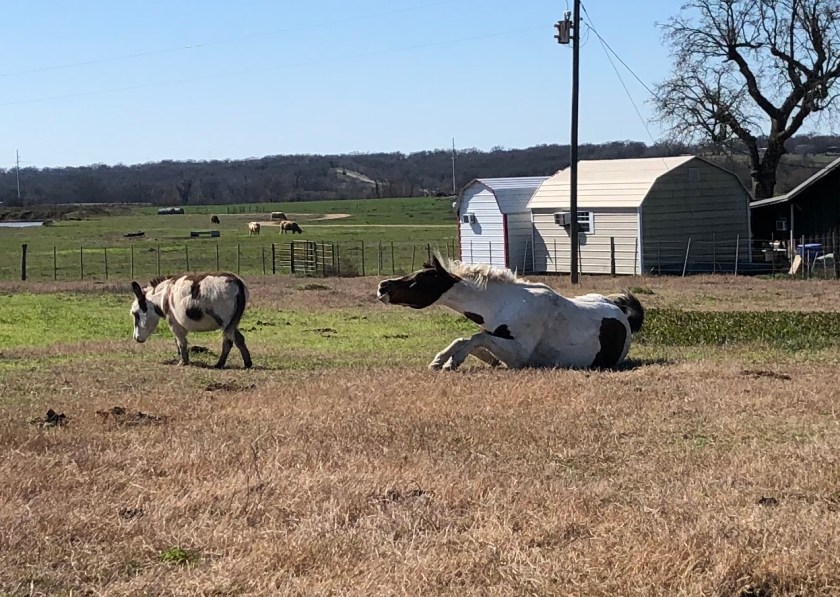 By the time we got back, the horses were happy to be set free in the small corral. Spice ran and ran and then dropped to roll. Apache waited a bit, then also did a bit of a roll. That had to feel good.